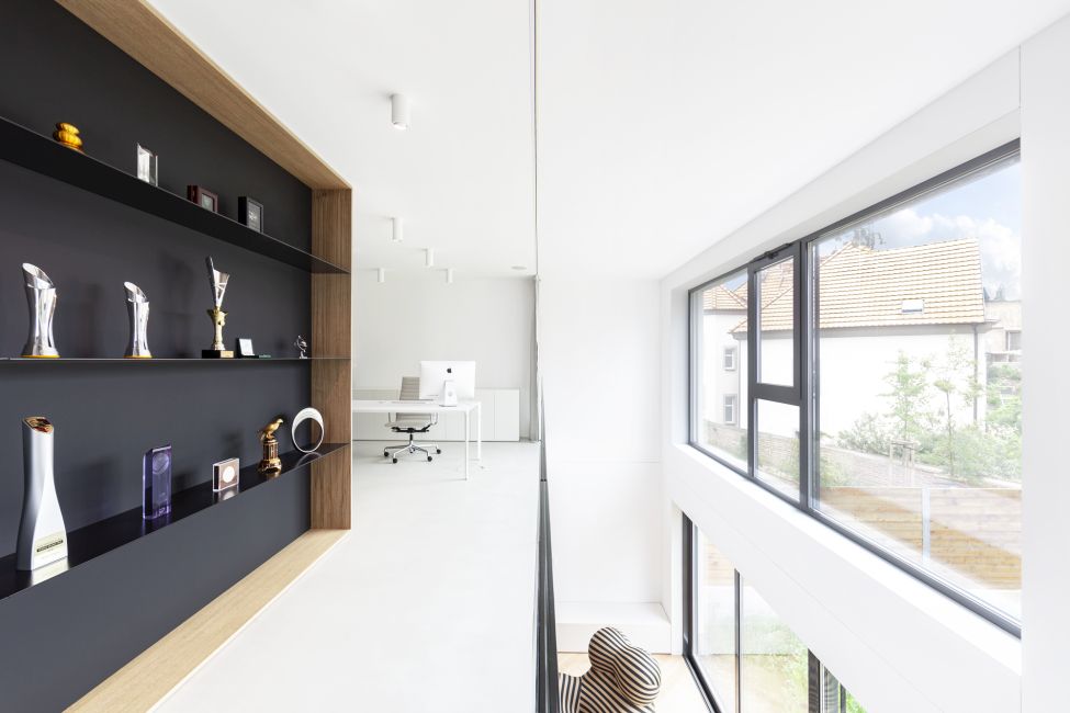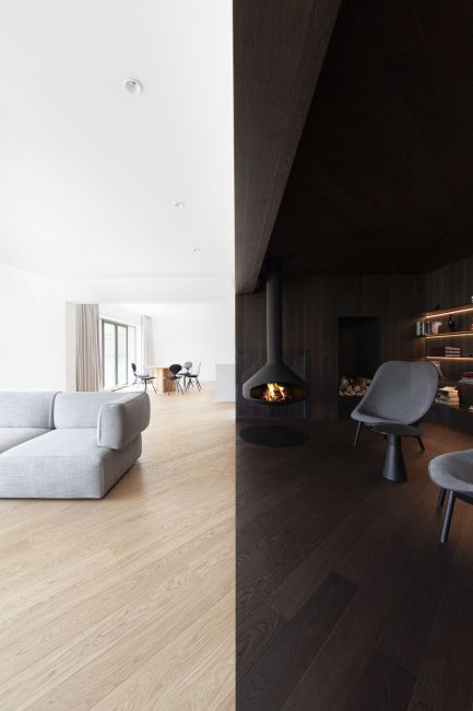 Dům se nachází ve svažitém terénu, do kterého je z jedné strany částečně zapuštěný. V prvním nadzemním podlaží, které je přístupné z ulice, se nachází garáž, uvítací hala a jedna ze dvou prostorných šaten. Na lobby následně navazuje pracovna, ve které autoři interiéru zásadním způsobem ovlivnili dispozice domu ubouráním části prvního nadzemního podlaží. „Chtěli jsme docílit efektu vzdušnosti a reprezentativních prostor, což nám stropy vysoké 2,8 metru neumožňovaly. Rozhodli jsme se proto vytvořit zde galerii,“ vysvětluje Roman Vrtiška. Vzniklá galerie tak propojila pracovnu a přilehlou „síň slávy“ s trofejemi ze sportovních soutěží s centrální obytnou místností, která se nachází o patro níže. Obyvatelé domu tak spolu mohou v případě potřeby komunikovat napříč místnostmi i patry, ale primárně jim zůstává zachované soukromí. Do dalších prostorů domu vede schodiště v provedení tmavého odstínu dubové dýhy, a kromě něj jsou jednotlivá podlaží propojena také výtahem. V nejnižším podlaží, do kterého je otevřená galerie, se nachází velký centrální prostor sdružující obývací pokoj, kuchyni v černo bílém provedení a jídelnu. Dominantou obývacího pokoje je ikonické křeslo UP od italské firmy B&B Italia, které vhodně doplňují konferenční a odkládací stolek HRIB, které designérské duo Vrtiška & Žák navrhlo pro slovenského výrobce Javorina. Obývací část pak plynule přechází v odpočinkovou zónu s posezením u krbu, výklenek, který je nejvýraznějším příkladem důmyslné práce s tonalitami dřeva – celý je vyvedený v tmavém provedení a s černými doplňky.