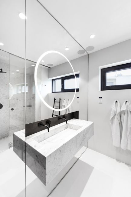 Koncept celé vily stojí na účelné kombinaci světlých a tmavých odstínů, aplikovaných vždy v závislosti na významu a funkci daného prostoru. „Tímto způsobem jsme se snažili využívat potenciálu psychologie barev, kdy jsme světlé tóny používali primárně v aktivních denních zónách, zatímco ty tmavé naopak v prostorech určených k relaxaci a zklidnění,“ popisuje spoluautor návrhu Roman Vrtiška. Napříč všemi čtyřmi podlažími se tak ve vzájemném kontrastu nesou bílá a černá barva, pocitově utlumené použitím dřeva. „Celým objektem prostupují rafinované pomyslné bloky v dřevěných obkladech, které kontrastují s přírodním mramorem a světlými cementovými stěrkami,“ dodává Roman Vrtiška.