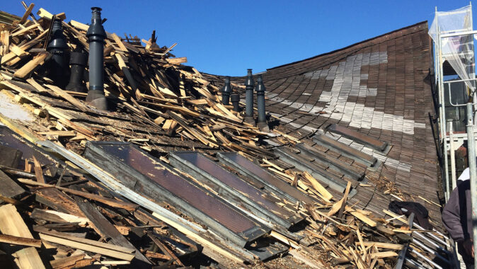 tvarovanou střechu – dřevěný šindel navíc nekvalitní, řezaný z prken.