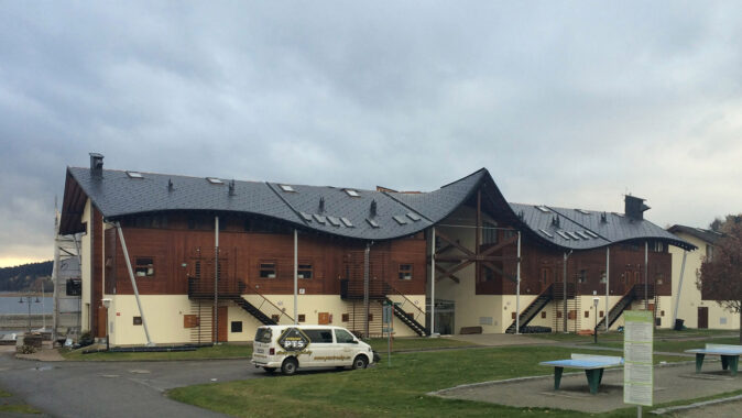 Působivě rozvlněné střechy objektů a navržená technická řešení střešních