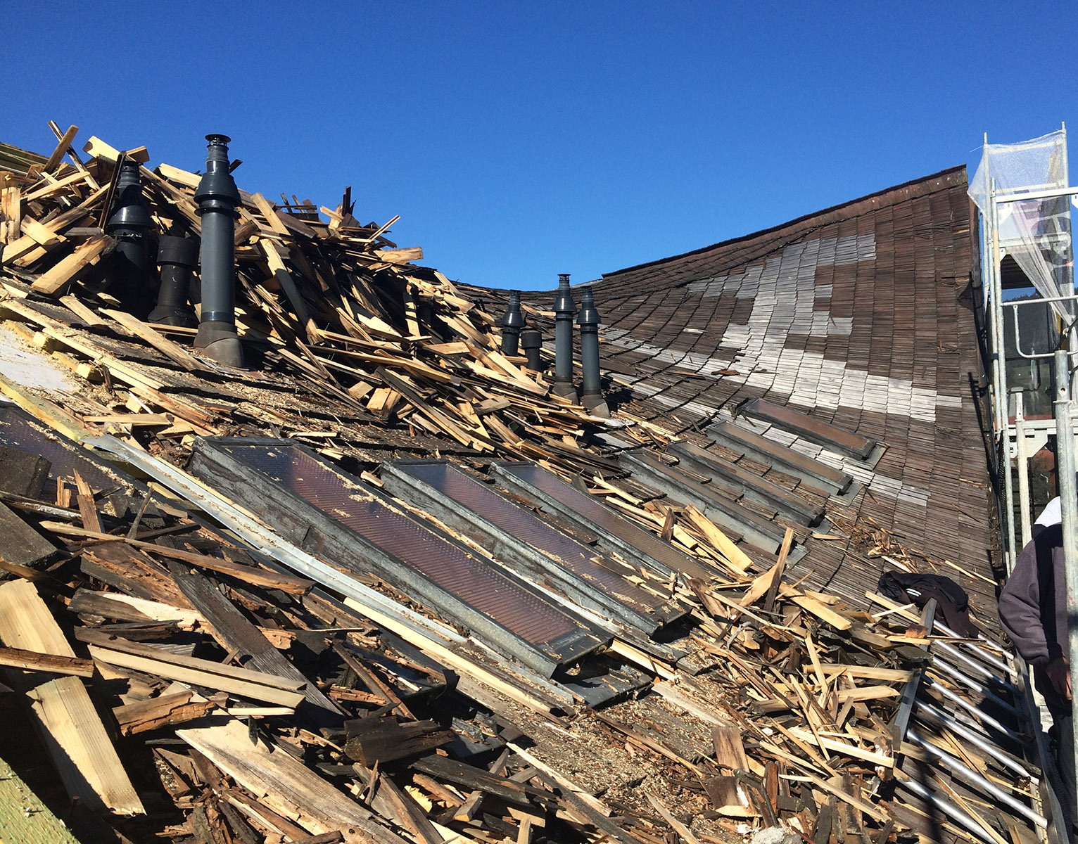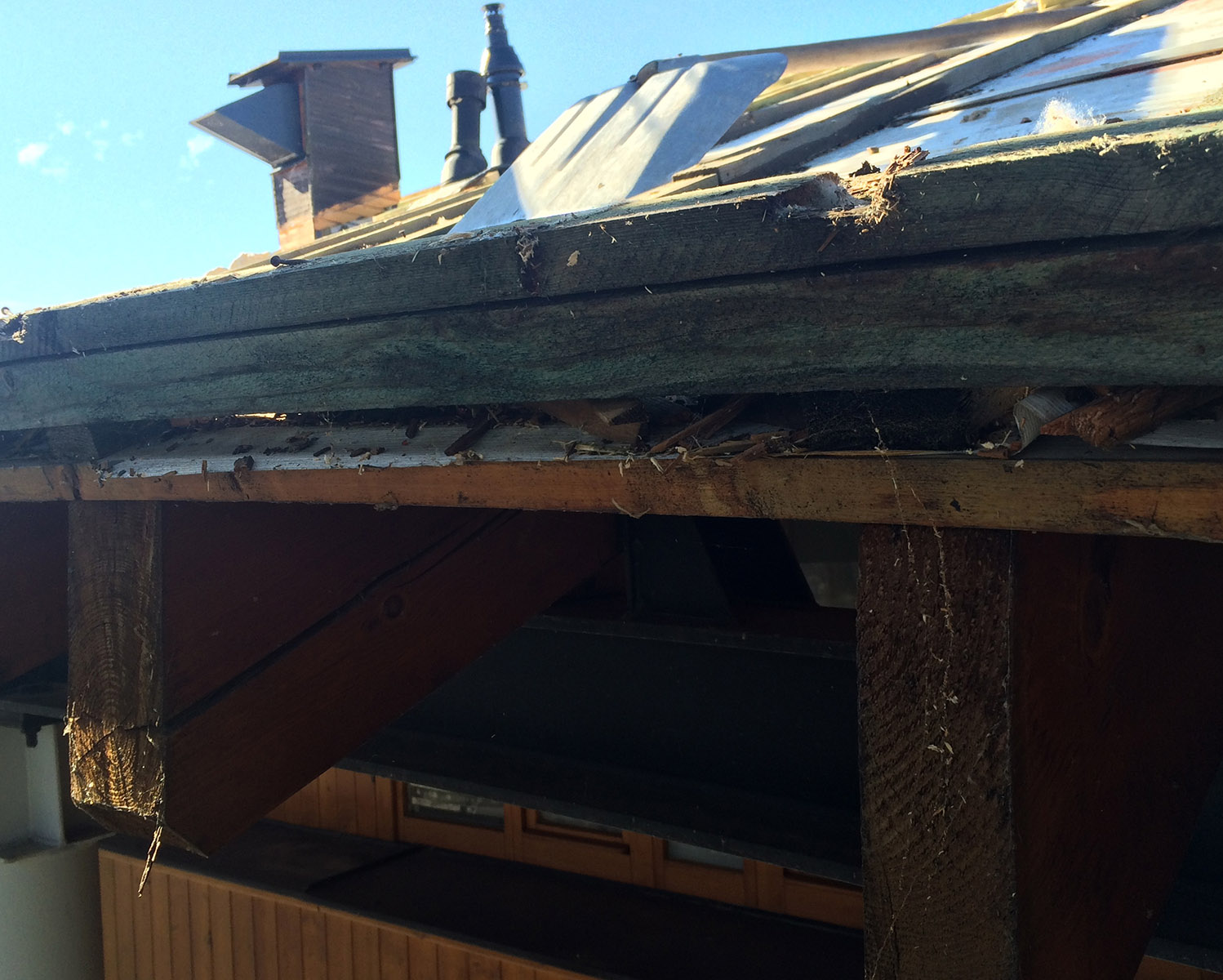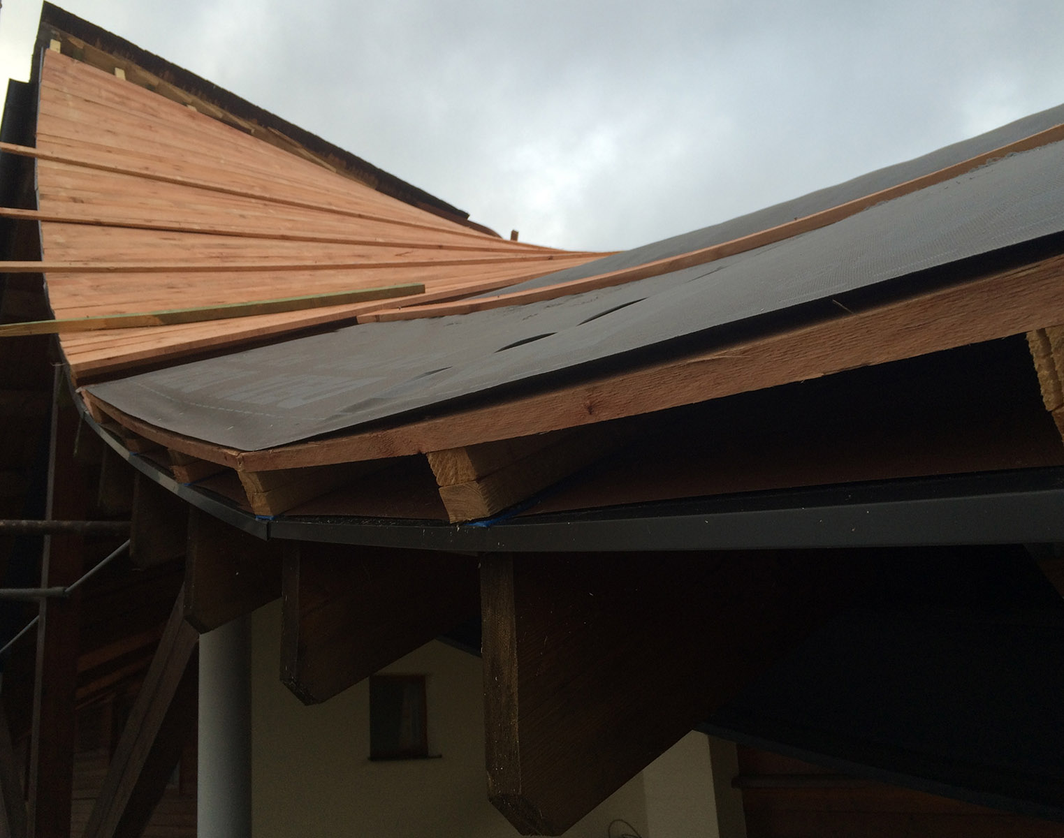 tvarovanou střechu – dřevěný šindel navíc nekvalitní, řezaný z prken.