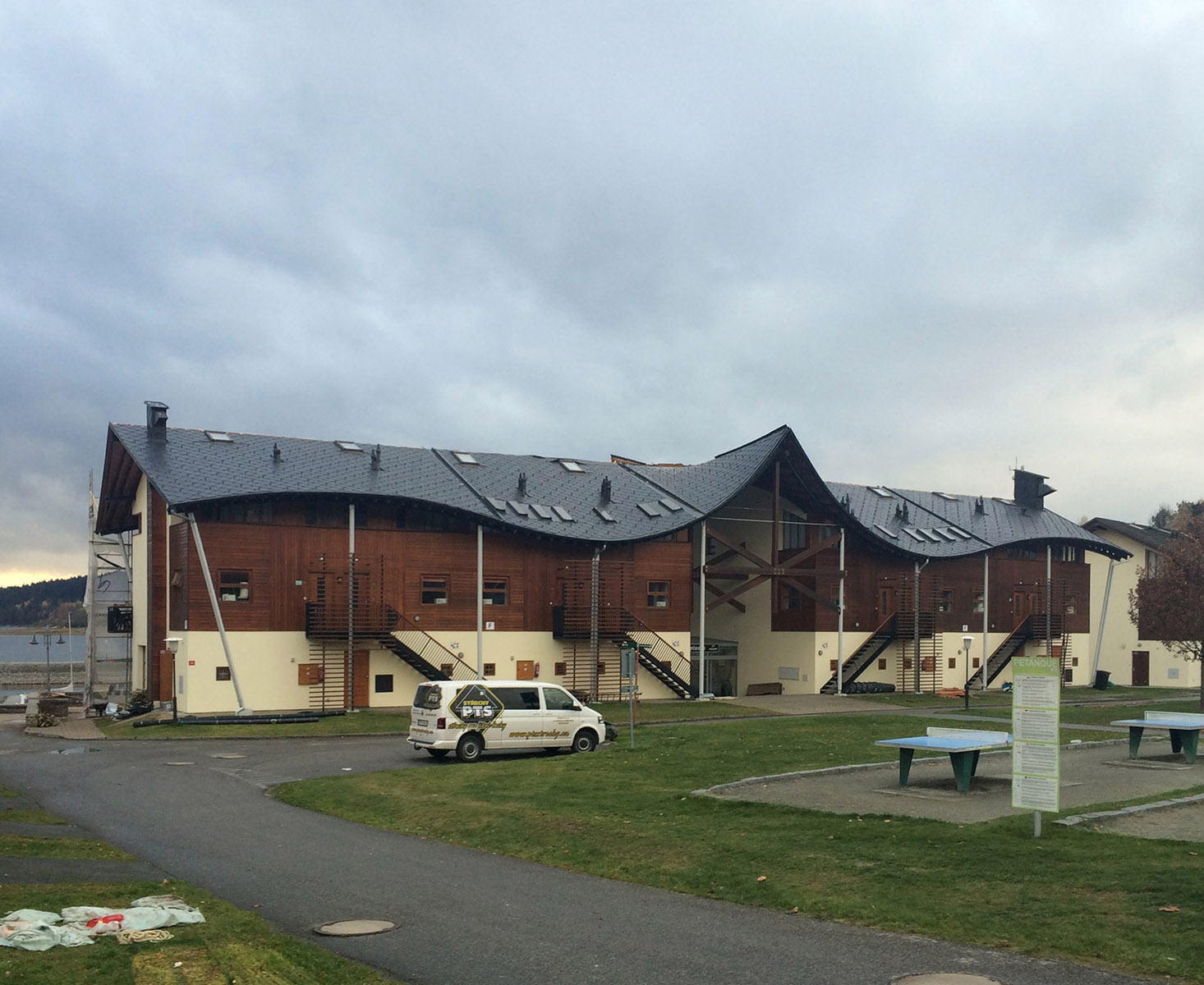Působivě rozvlněné střechy objektů a navržená technická řešení střešních