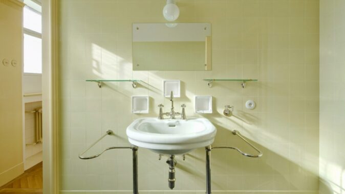 „Interiéry koupelen byly v osmdesátých letech rekonstruovány. Původní umyvadla byla nahrazena novodobými a keramické obklady byly nahrazeny mramorovými. Originální schránky na mýdlo, tzv. mýdlenky však byly odstraněny nešetrným způsobem a nebyly zachovány ani ve fragmentu. Po sejmutí nových obkladů byly na svém místě pouze úlomky střepu v původní vápenocementové, pokládkové vrstvě, tzv. buchtách. Vnitřní keramické obklady ostění mezi okny koupelen zůstaly zachovány. Při rozhodování o barevném odstínu nových replik se vycházelo právě z těchto detailů,“ říká Petr Miklíček, restaurátor keramiky s licencí MK ČR, a pokračuje: „Po dřívějších zkušenostech z Vily Tugendhat byla ke spolupráci vyzvána společnost LASSELSBERGER, výrobce keramických obkladů RAKO. Úkolem bylo přiblížit se co nejvíce původní technologii výroby. Tato technologie tehdy spočívala hlavně v použití olovnaté glazury na předem vypálený, kalibrovaný střep. Vysoký lesk a pokládka beze spár dávaly tehdejším stěnám charakteristický rys, který ještě dnes můžeme spatřit v objektech nezasažených modernizací interiéru. Přitom je paradoxem, že vývoj designu v oblasti keramiky se začíná vracet k počátku minulého století a většina světových firem má ve své nabídce obkladů a dlažeb vzory, vycházející právě z jednoduchosti a dekorativnosti 20.–30. let.“