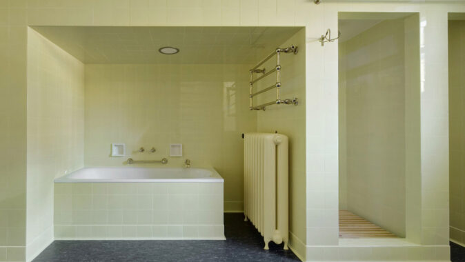 Požadavek na obklady koupelen byl tedy kalibrovaný, glazovaný střep ve žlutém odstínu – dle původních, zachovaných obkladů. Barva mýdlenek byla určena výše zmíněným úlomkem, zakonzervovaným v omítce pokládky z 80. let, tedy bílá. Společnost LASSELSBERGER, výrobce tradiční české značky RAKO, dodala několik vzorků a po korekcích barevnosti, povrchu byla schválena finální podoba obkladu ve finálním kalibrovaném rozměru 149×149 mm. Na předpřipravenou stěnu v absolutní rovině byly obklady kladeny se spárou 1 mm.