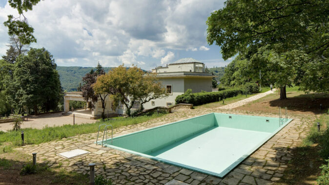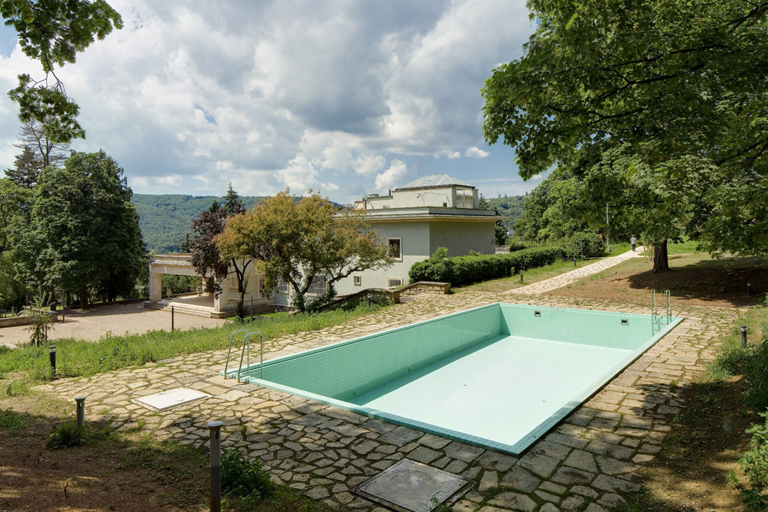 Současný vývoj a výroba obkladů pro rekonstrukci venkovního bazénu probíhal podobně jako v případě koupelen – podle předaného kousku odštíplého původního obkladu. V Horní Bříze bylo vyrobeno 180 m² obkladů RAKO ve speciální světle zelené a ve formátu 97×97 mm. Dalších 1350 kusů se zaoblenou hranou bylo výsledkem ručního opracování hrany s následným glazováním.Rodina Stiassni bydlela ve vile pouhých devět let