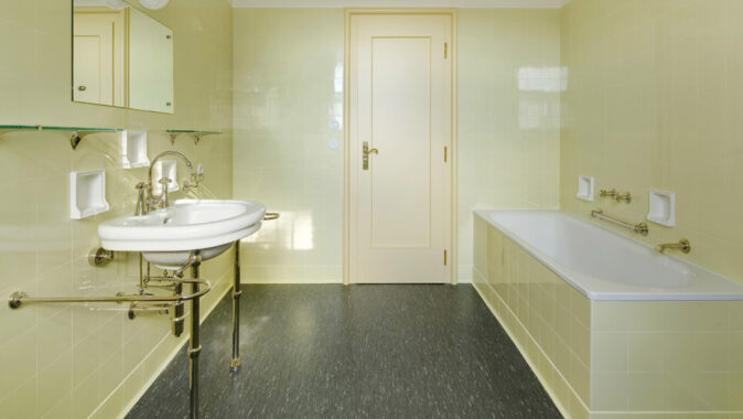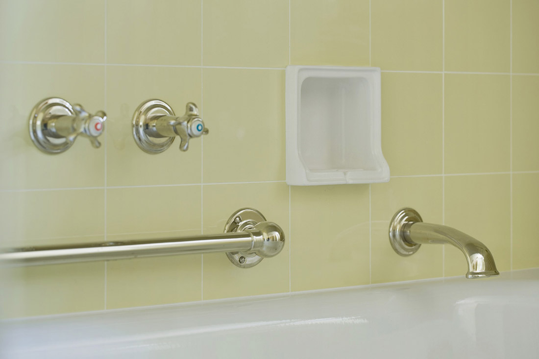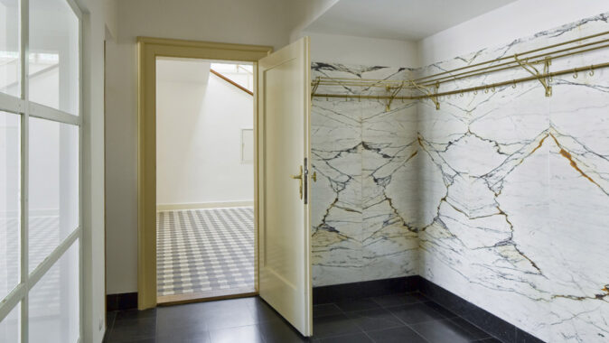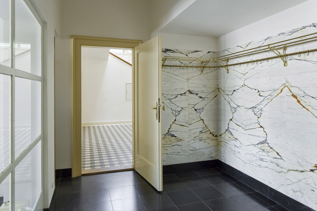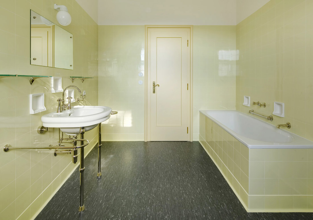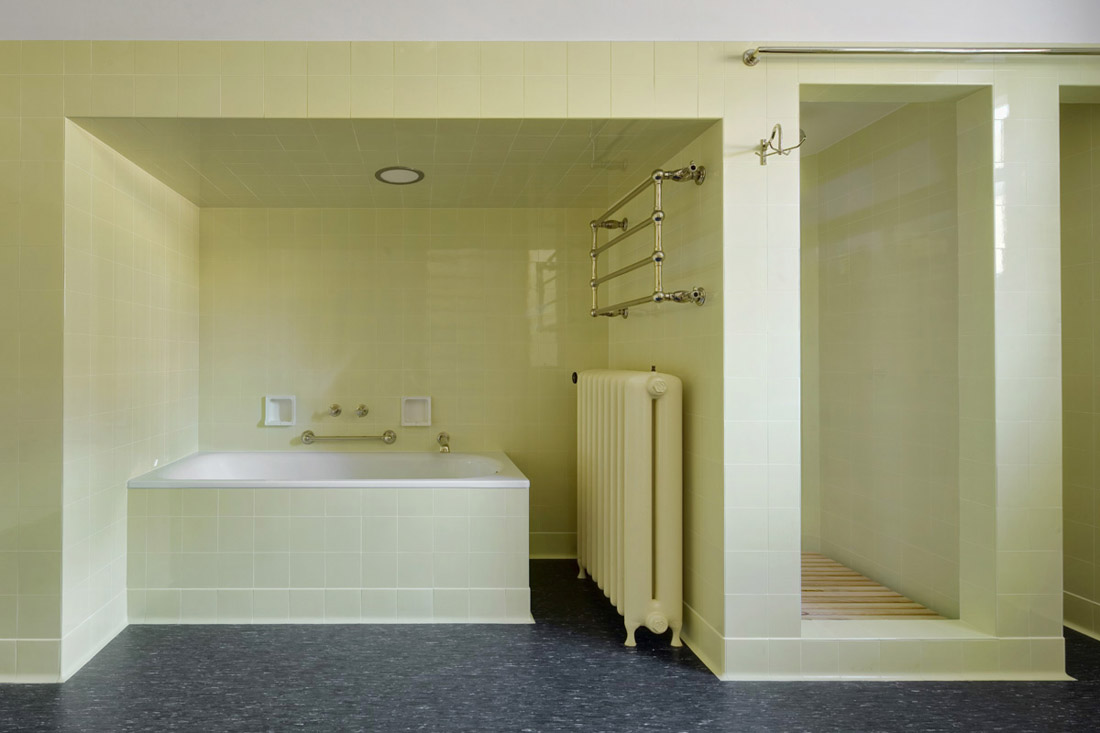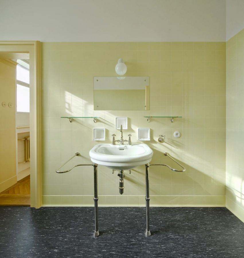 „Interiéry koupelen byly v osmdesátých letech rekonstruovány. Původní umyvadla byla nahrazena novodobými a keramické obklady byly nahrazeny mramorovými. Originální schránky na mýdlo, tzv. mýdlenky však byly odstraněny nešetrným způsobem a nebyly zachovány ani ve fragmentu. Po sejmutí nových obkladů byly na svém místě pouze úlomky střepu v původní vápenocementové, pokládkové vrstvě, tzv. buchtách. Vnitřní keramické obklady ostění mezi okny koupelen zůstaly zachovány. Při rozhodování o barevném odstínu nových replik se vycházelo právě z těchto detailů,“ říká Petr Miklíček, restaurátor keramiky s licencí MK ČR, a pokračuje: „Po dřívějších zkušenostech z Vily Tugendhat byla ke spolupráci vyzvána společnost LASSELSBERGER, výrobce keramických obkladů RAKO. Úkolem bylo přiblížit se co nejvíce původní technologii výroby. Tato technologie tehdy spočívala hlavně v použití olovnaté glazury na předem vypálený, kalibrovaný střep. Vysoký lesk a pokládka beze spár dávaly tehdejším stěnám charakteristický rys, který ještě dnes můžeme spatřit v objektech nezasažených modernizací interiéru. Přitom je paradoxem, že vývoj designu v oblasti keramiky se začíná vracet k počátku minulého století a většina světových firem má ve své nabídce obkladů a dlažeb vzory, vycházející právě z jednoduchosti a dekorativnosti 20.–30. let.“