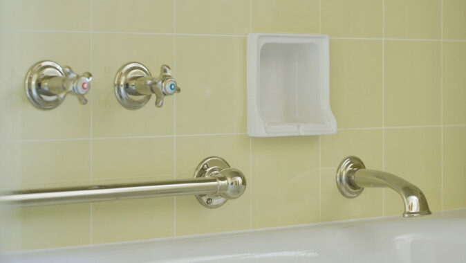 Požadavek na obklady koupelen byl tedy kalibrovaný, glazovaný střep ve žlutém odstínu – dle původních, zachovaných obkladů. Barva mýdlenek byla určena výše zmíněným úlomkem, zakonzervovaným v omítce pokládky z 80. let, tedy bílá. Společnost LASSELSBERGER, výrobce tradiční české značky RAKO, dodala několik vzorků a po korekcích barevnosti, povrchu byla schválena finální podoba obkladu ve finálním kalibrovaném rozměru 149×149 mm. Na předpřipravenou stěnu v absolutní rovině byly obklady kladeny se spárou 1 mm.