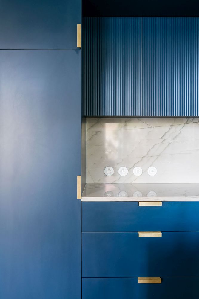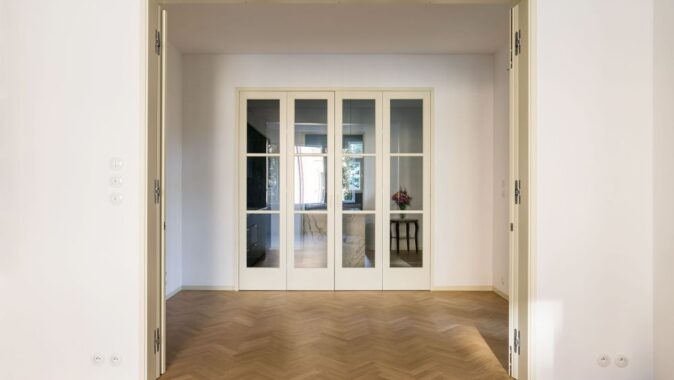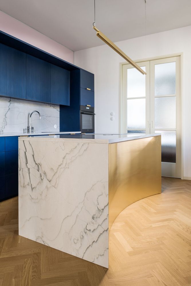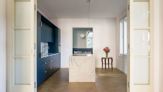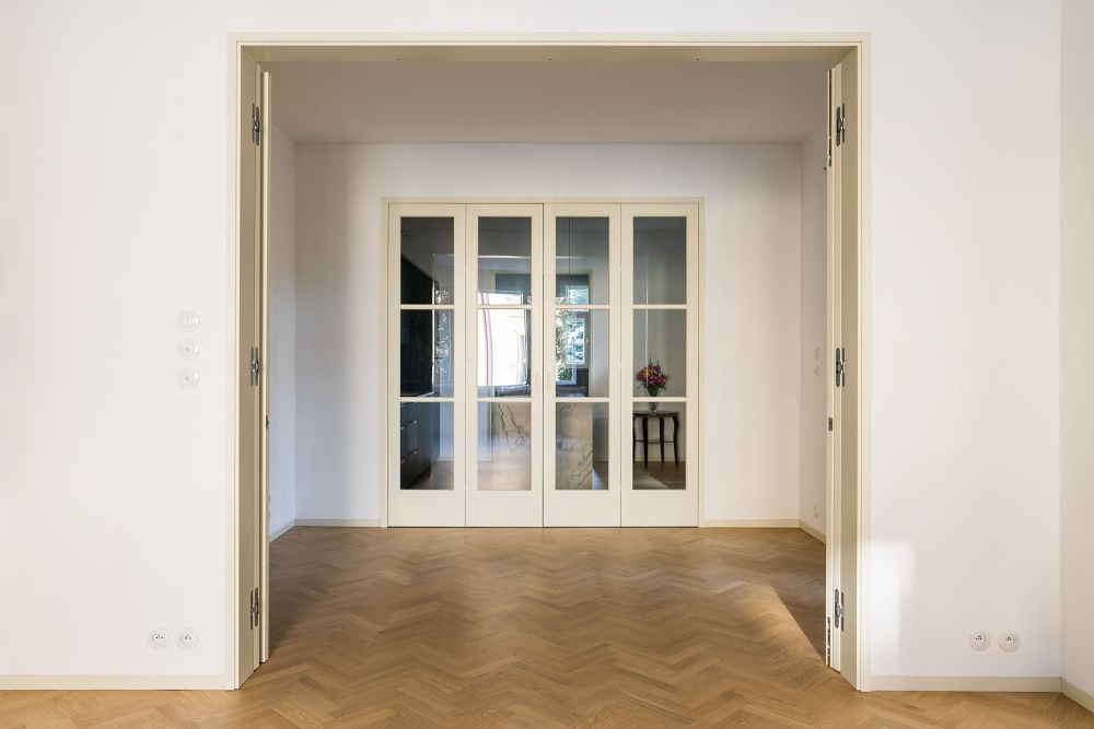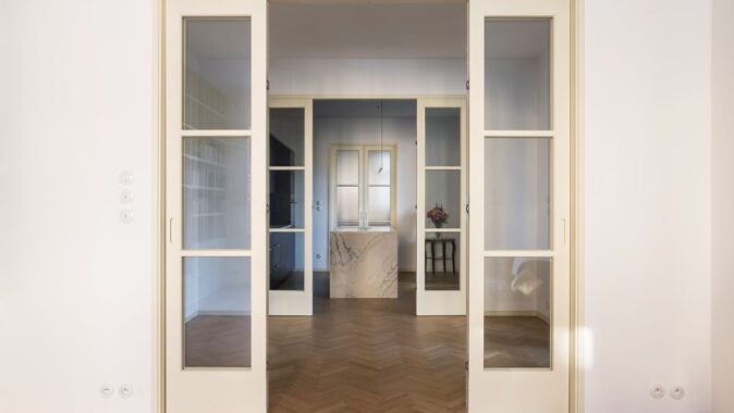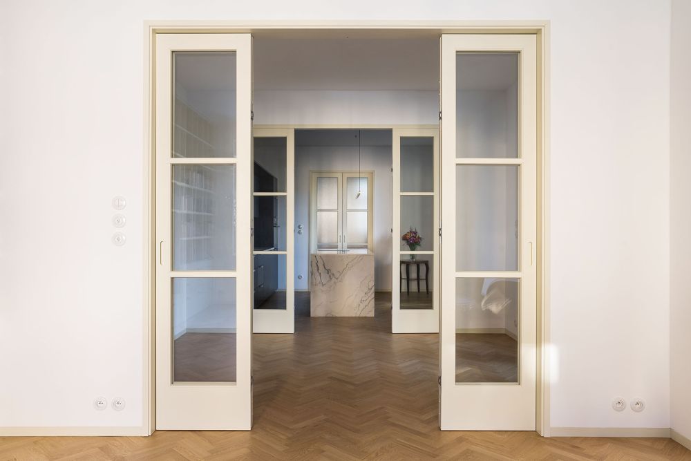 Byt bude užívaný mladým manželským párom, pričom myslíme na rozrastanie rodiny. Snažíme sa zachovať génius loci tohto bytu, no zároveň prispôsobiť priestor denným potrebám súčasného človeka. Dispozícií dominuje trojica za sebou radených miestností: kuchyňa, jedáleň a obývacia izba. Tieto priestory sú prepojené rozmernými 4–krídlovými dverami, čiže sa ľahko transformujú v jeden celok. Na rovnakom princípe funguje prepojenie obývacej izby a pracovne, pripravenej na konverziu v detskú izbu. Spálňa sa napája na dennú zónu z kuchyne, alebo cez priechodný šatník a kúpeľňu priamo zo zádveria. Naprieč bytom sa tiahne šatníková stena, ktorá poskytuje dostatok úložného priestoru pre celú rodinu.