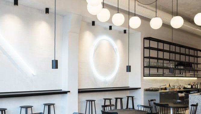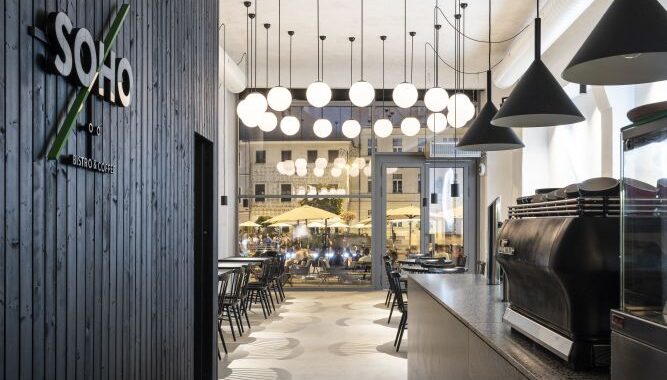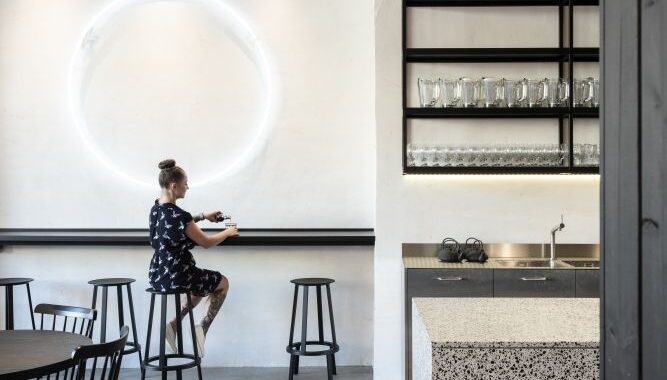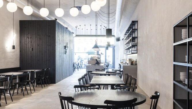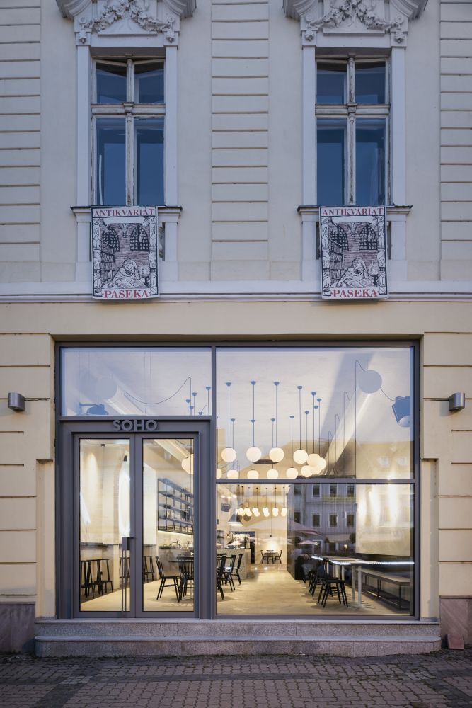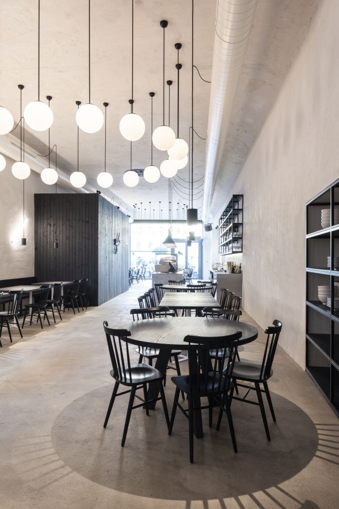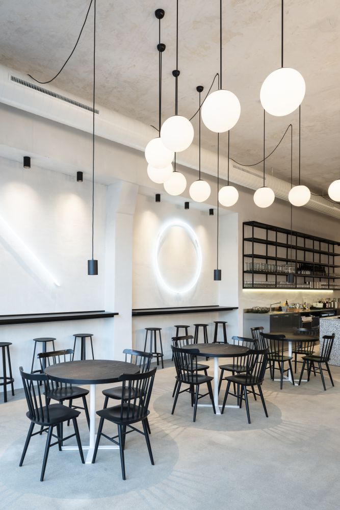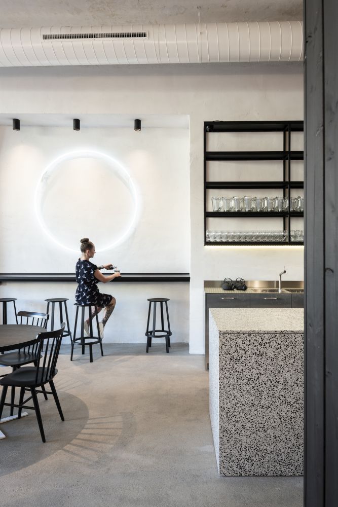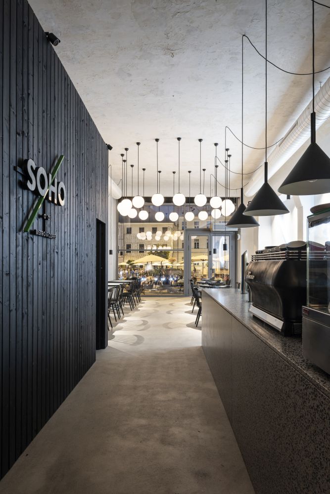 Interiér jsme rozdělili na dva celky: světlou část restaurace a tmavou s kuchyní a toaletami. Restaurace má uprostřed bar a zázemí, které jsme ukryli do černého boxu se skladem a schodištěm, které vede do suterénu. Vznikl tak kontrast vůči barovému pultu s černobílého terazza. Na stropě jsme ponechali strukturu původních vrstev nátěrů, stěny sjednotili omítkou v kontextuální barevnosti. Mobiliář je jednoduchý, vyrobená z černé bukové překližky.