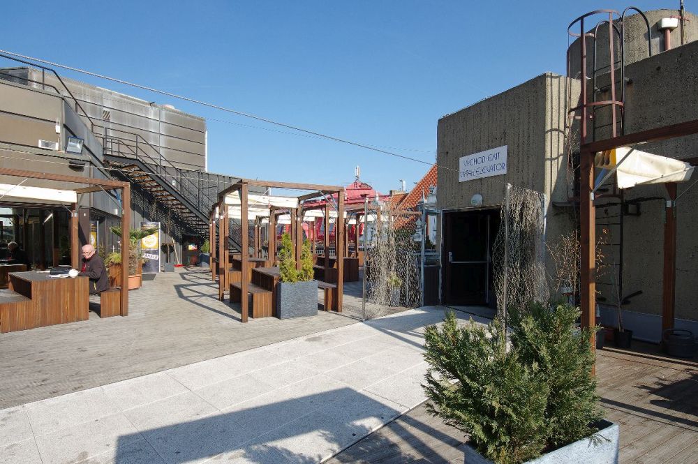 Restaurace na terase obchodního domu Kotva v Praze vychází z temného genia loci budovy. Industriálně-tesařský svět pergol, nábytku, schodišť a dětských prolézaček navazuje na střešní krajinu objektu, který představuje kontroverzní, ale výraznou architekturu uprostřed historické zástavby. Snažili jsme se málo měnit, málo dodat, spíše očistit a repasovat konstrukce hexagonálních hřibovitých stropů a oživit střechu s krásným a neobvyklým pohledem na Staré Město.