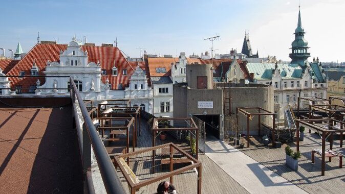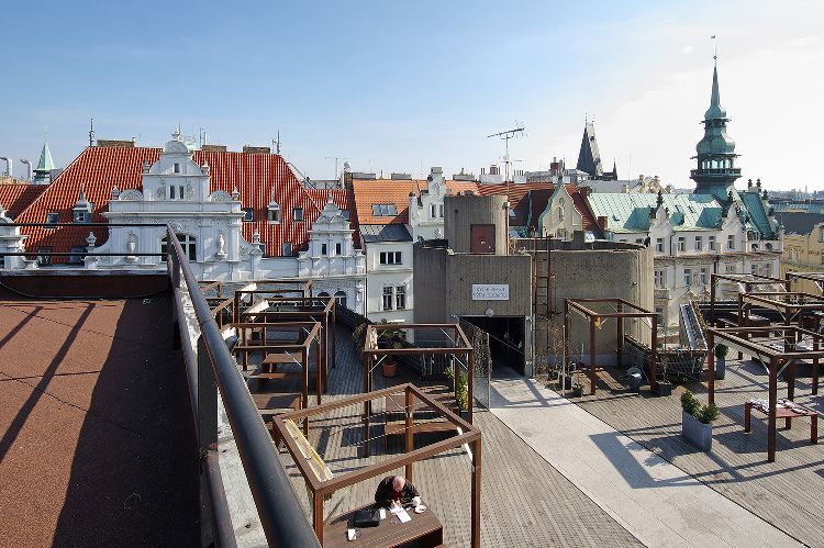 Restaurace na terase obchodního domu Kotva nabídla příjemné posezení i v letošním parném létě. Výhled na střechy Starého Města je ojedinělý (a dojem nekazí ani jídelníček a obsluha nebo |cenová skupina|). Bylo by skvělé, kdyby tímto způsobem nabídly veřejnosti své terasy i další obchodní nebo multifunkční domy. Nebo alespoň ty, které to měly v původních projektech – Bílá labuť, Máj, Tančící dům.