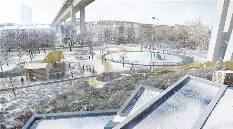 „Cílem našeho návrhu byla přeměna málo využívaného „plácku“ pod Nuselským mostem v atraktivní veřejný prostor v podobě volnočasového areálu, který bude nabízet celoroční využití díky plochám a zázemí pro řadu aktivit a sportů, a stane se místem, kde budou všichni Pražané, tedy nejen obyvatelé bezprostředního okolí, rádi trávit svůj volný čas. Na zanedbaném prostoru, kam roky nebyl důvod jít, se začne konečně žít,“ říká architektka.