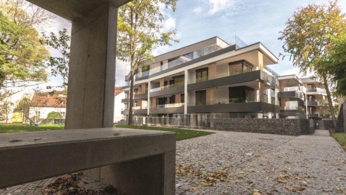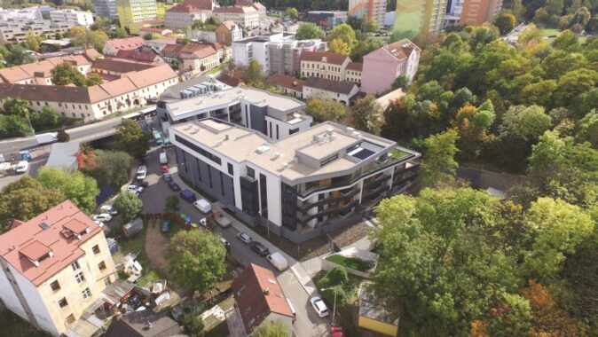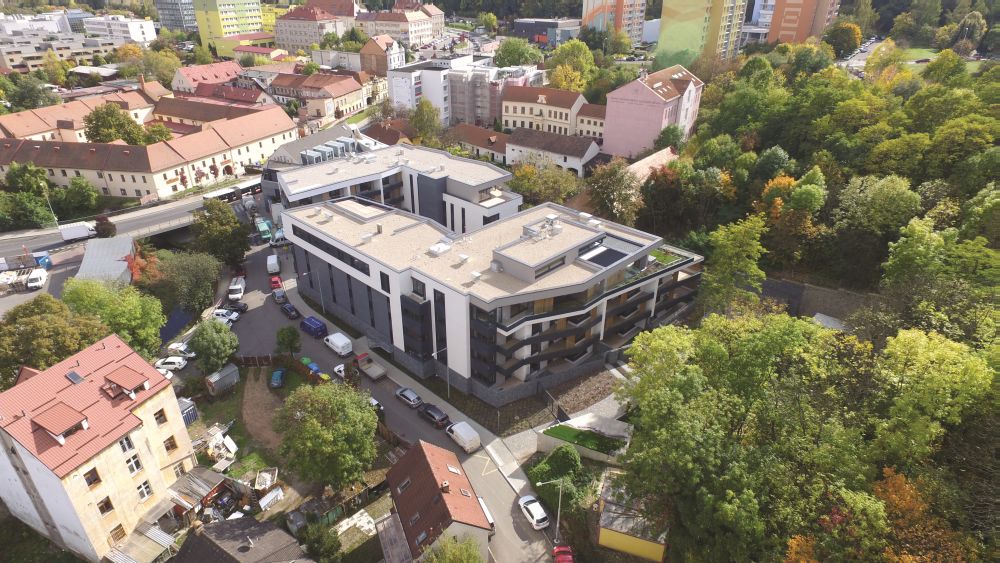 Objem domu tvoří dvě stavby ve tvaru písmene L, které jsou vůči sobě natočeny tak, že mezi sebou vytváří polouzavřený dvůr ve tvaru pravidelného obdélníka. Ten slouží jako zklidněná vstupní část, do které jsou situovány oba hlavní vstupy, a z něhož lze dál projít do odpočinkové zahrady v západní části pozemku. V zahradě je umístěn altán a menší dětské hřiště. Od ulice je pak zahrada oddělena přístřeškem na odpadky a oplocením s vjezdovou bránou.