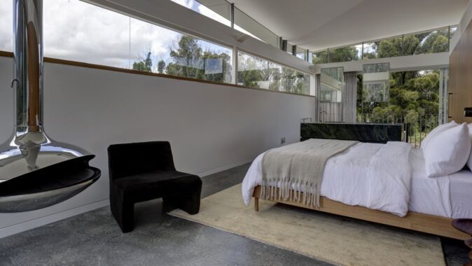 Dům se rozprostírá na třech úrovních v souladu se spádem země. Ve spodním patře, které je částečně zapuštěné do svahu, se nachází společenská místnost s televizí a samostatná herna pro zabavení dětí i dospělých. Do středu domu architekti umístili prostornou kuchyni s jídelnou a obývací částí doplněnou otevřeným krbem a velkými otočnými skleněnými okny, které rámují výhled ven. Jelikož charakter prostředí, ve kterém je dům situovaný, přímo vybízí k maximalizaci propojení interiéru s exteriérem, architekti vybavili velkoformátovým zasklením také všechny ložnice. Ty tak skýtají dechberoucí výhledy na okolní hory a křovinaté porosty obnovené po nedávných požárech. Jedinečné panorama se pak rozprostírá za okny hlavní ložnice, která se nachází ve vyvýšené úrovni nad zbytkem domu. K venkovnímu vyžití slouží dva velké kryté prostory s vestavěným grilem, bazén, vířivka i venkovní ohniště, které umožňuje stolování přímo pod širým nebem.