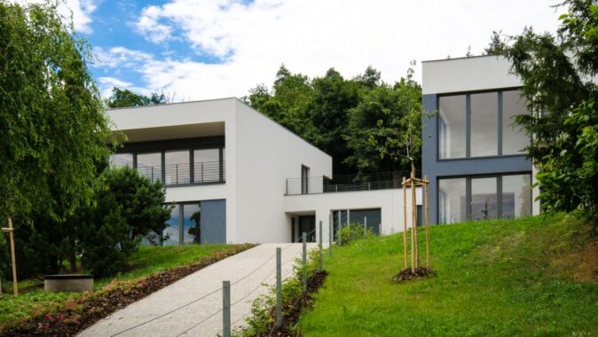 Parcela polygonálního tvaru leží ve svažitém terénu s problematickou severovýchodní orientací. Na pozemek je možno se dostat dvěma vjezdy: hlavním vjezdem ze severovýchodní strany a obslužným vjezdem u jižního cípu v horní části. Ze severozápadní a východní strany je parcela ohraničena sousedními pozemky s rodinnými domy, z jihozápadu je obklopena lesem a ze severovýchodní strany je vymezena místní komunikací. Svažitý pozemek je omezující z hlediska oslunění, avšak nabízel možnost práce s výhledy do krajiny.
