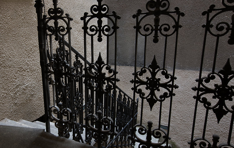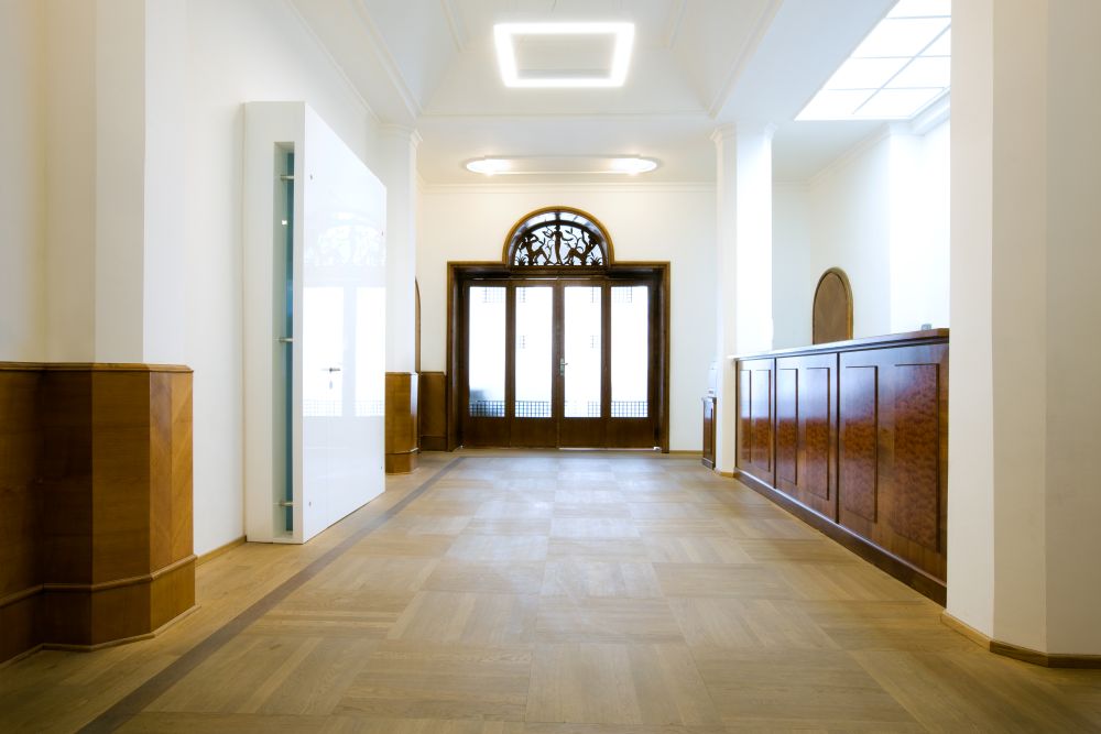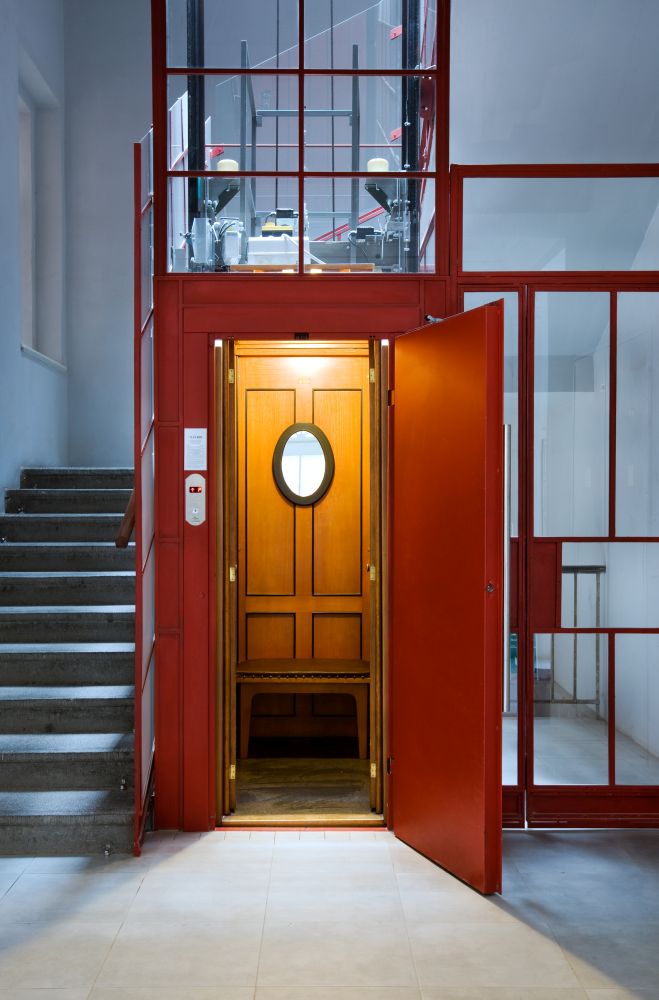 krásný výtah z roku 1928. Jeho dráha byla prodloužena do podkroví, kde vznikly