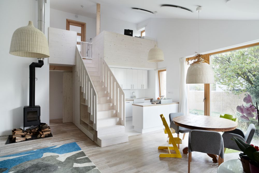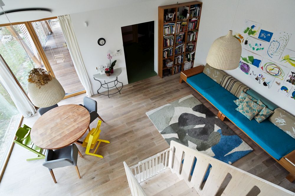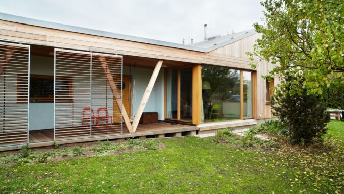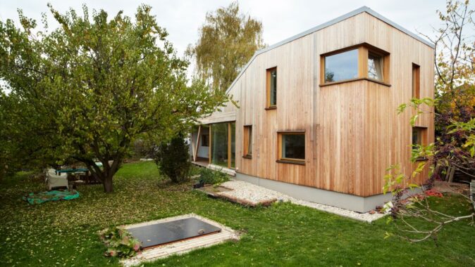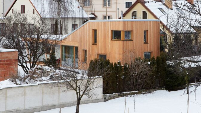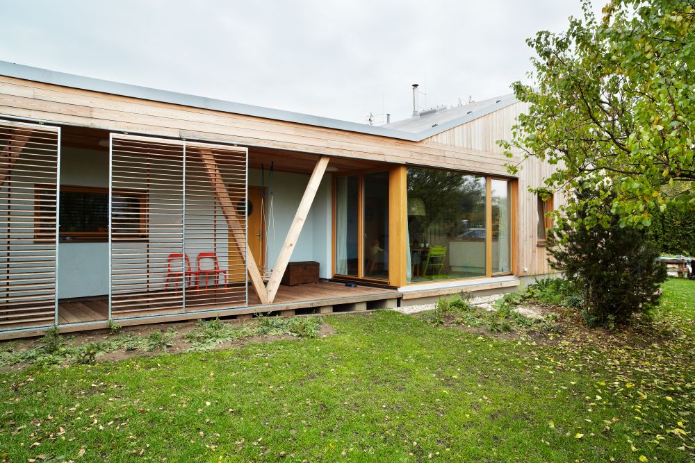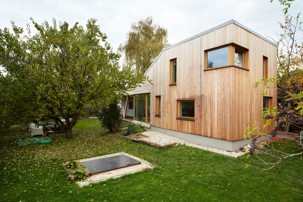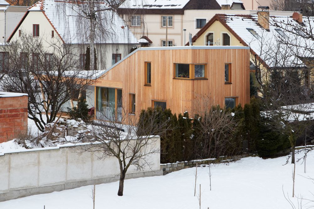 Novostavba je volně stojícím objektem přiléhajícím ke starší garáži. Do tvaru domu se promítlo přání investora zachovat garáž a vzrostlou třešeň v severovýchodním rohu pozemku. Vzhledem k plánované stavbě sousedního objektu byla také zpracovaná studie oslunění, která měla vliv na umístění oken. Cílem návrhu bylo osadit dům na pozemek tak, aby se zahrada stala rozšířeným obytným prostorem a západní slunce si našlo cestu do denní místnosti. Aby se dům stal příjemným a vlídným ke svému okolí a respektoval povahu jeho obyvatel.