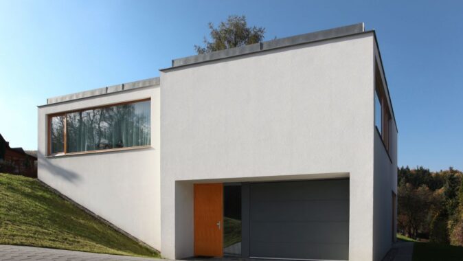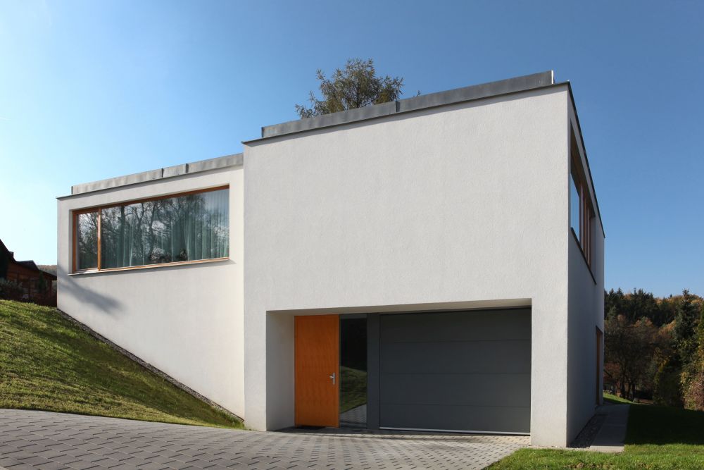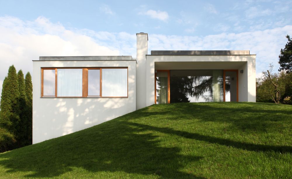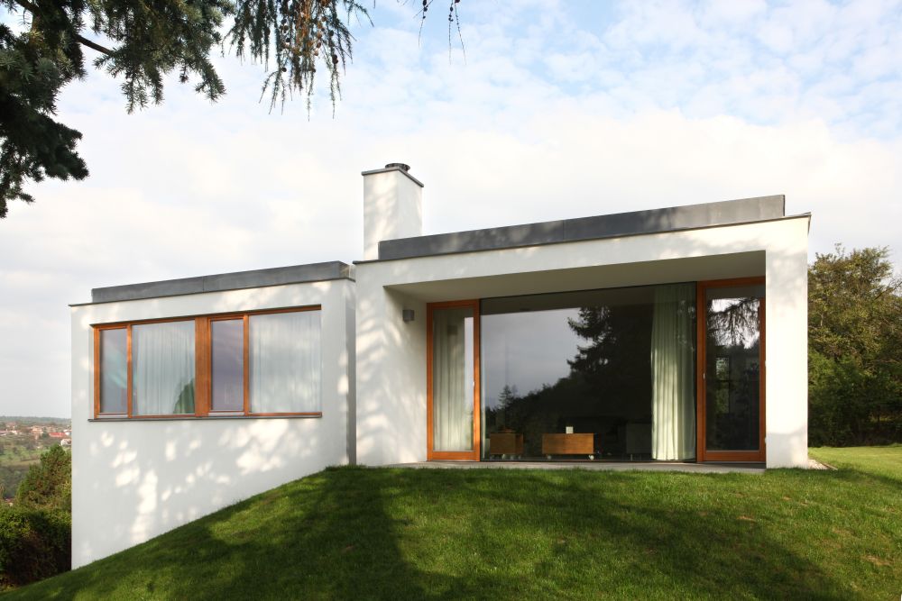 zalesněný horizont a východní okraj města. Osazení domu využívá přirozený