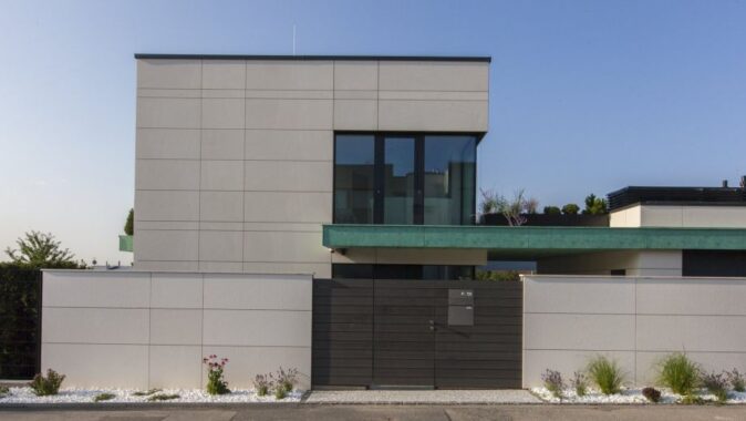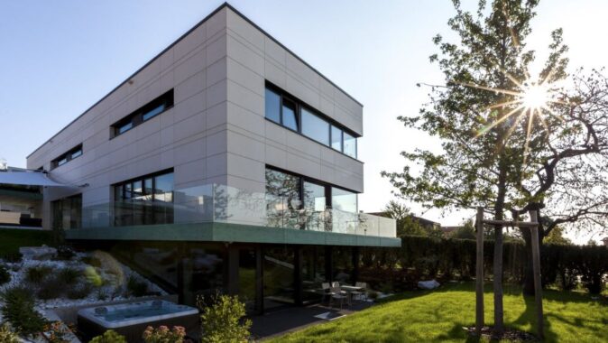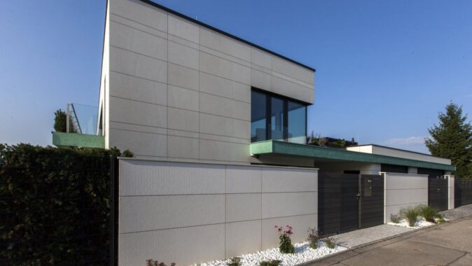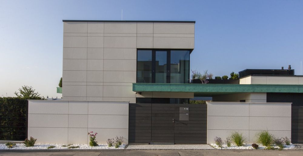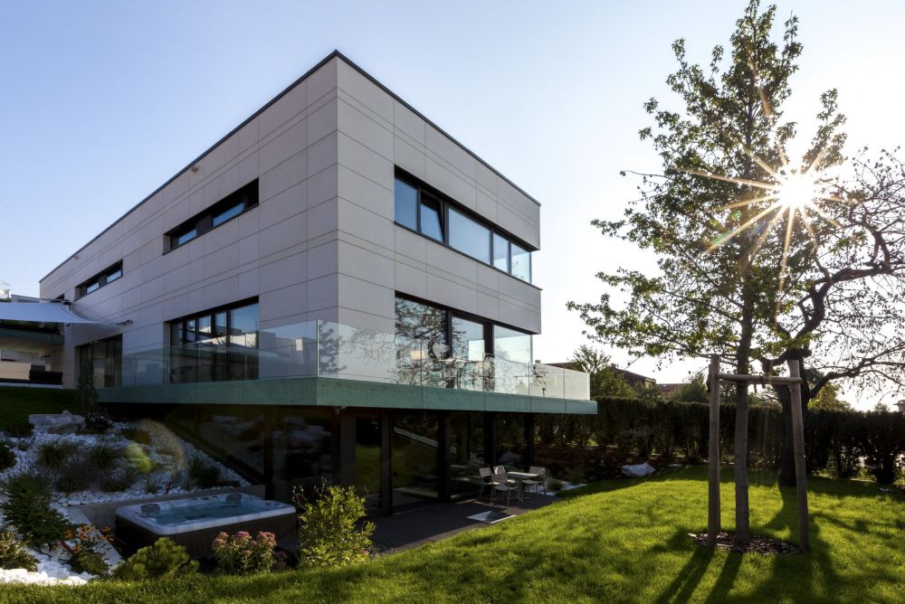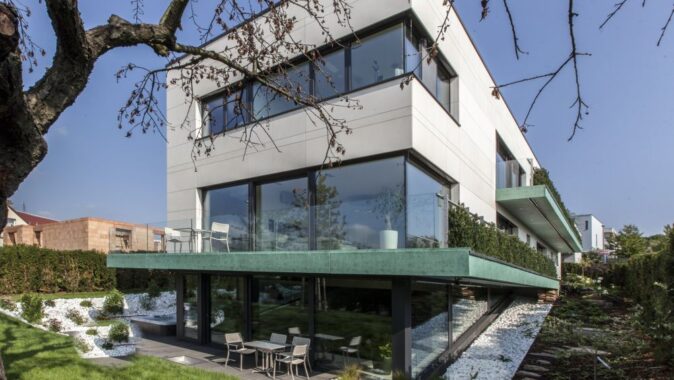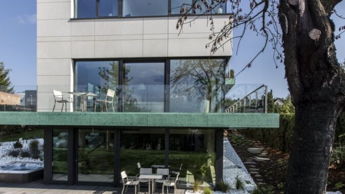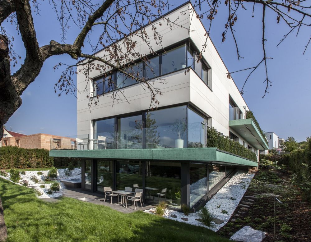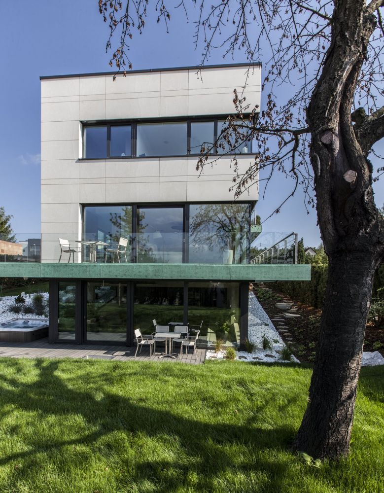 Nejsložitějším úkolem bylo sladění požadavků investora a omezujících vlivů plynoucích z velikosti pozemku a okolní zástavby. Hmotu domu tvoří jednoduchý kvádr, z něhož vystupují balkony se „zeleným“ zábradlím. Na severní části pozemku je k němu přidružen samostatný objekt garáží. Hlavní vstup je  z ulice při severní straně pozemku v úrovni prvního nadzemního podlaží, kde se nachází denní část domu, kterou tvoří prostorný obývací pokoj s volně propojenou kuchyní. Dále je zde hala s točitým schodištěm se skleněnými stupni, které propojuje všechna podlaží. Schodišťový tubus je zastřešen světlíkem – záměrem bylo umožnit dennímu světlu proniknout do úrovně wellness. Z obývacího pokoje vede další přímé schodiště do ložnicového patra. Na obývací pokoj navazuje letní obytný prostor se zahradní kuchyní.
