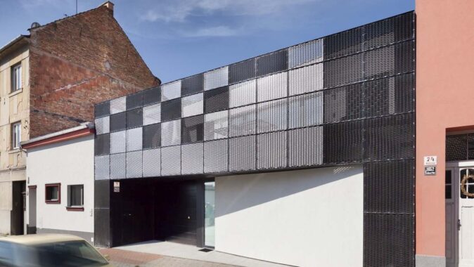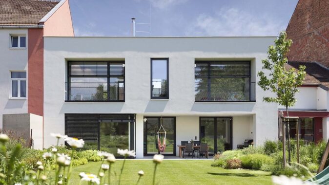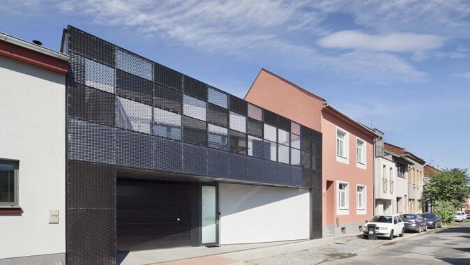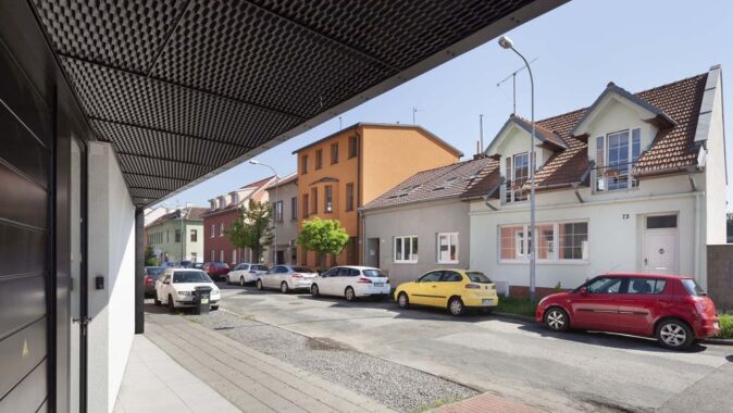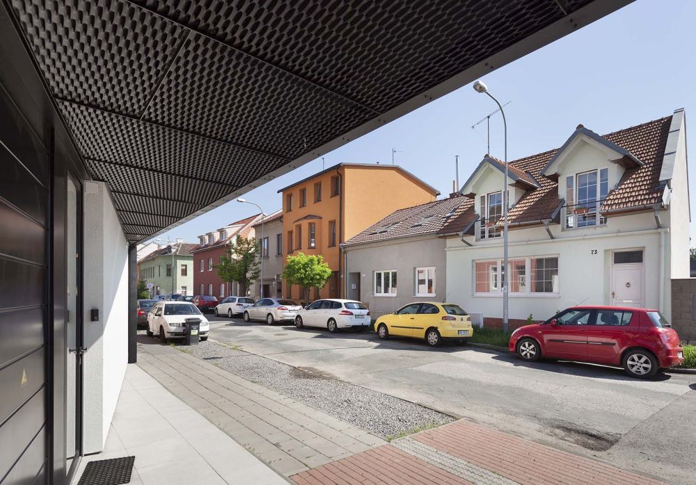 Dům je dalším dílkem do pestré mozaiky ulice, tvořené směsicí objektů různých barev, tvarů a velikostí, jejichž jediným pojítkem je uliční čára – což vlastně stačí. Plocha k „vyplnění“ domem tak byla v podstatě dána. Z východu uliční čárou, ze západu linií zahradní fasády sousedního objektu, ve zbylých dvou směrech štíty sousedních domů.