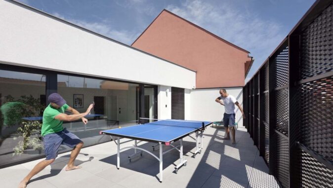 Větší hloubku stavby založenou na těchto návaznostech jsme využili k vytvoření polosoukromého venkovního prostoru v patře a zapuštěné kryté terasy v přízemí, navazující na hlavní obytný prostor. Těmito „výkusy“ z hmoty domu a umístěním schodiště v jeho středu je prosvětlena hlubší dispozice přízemí.