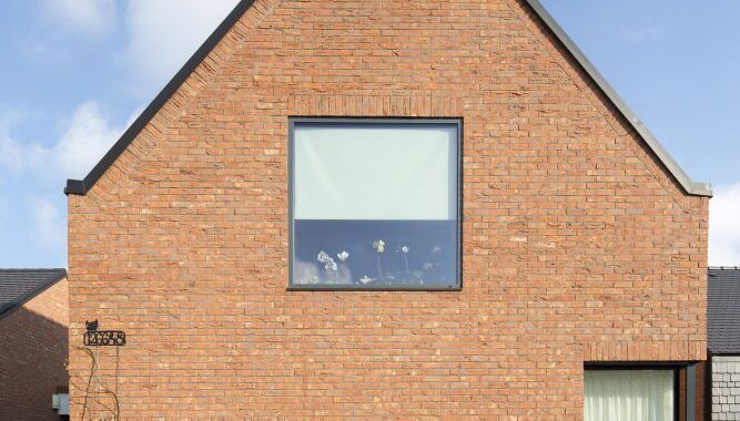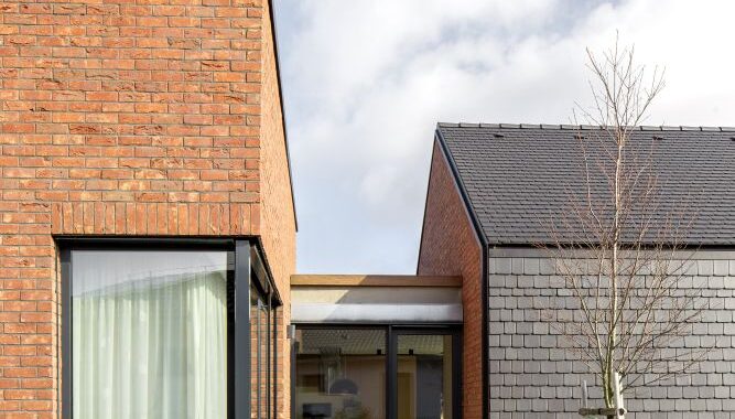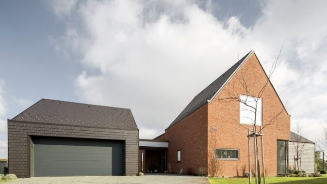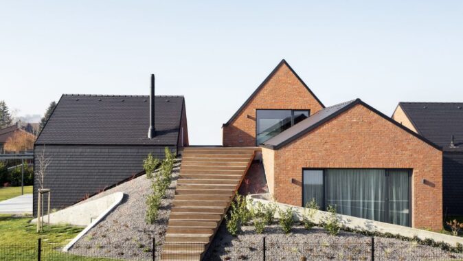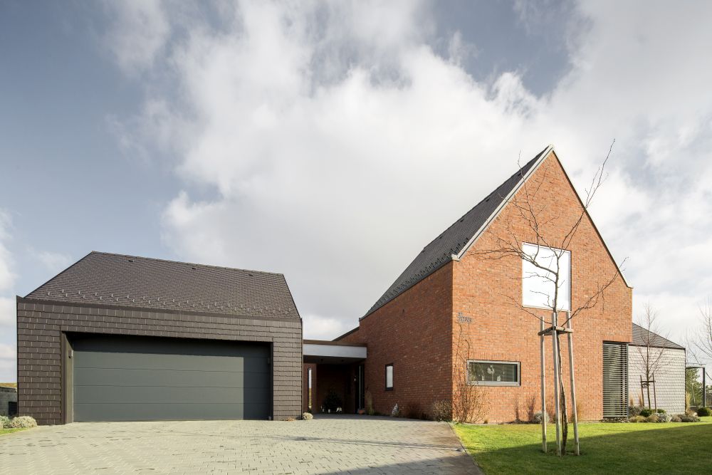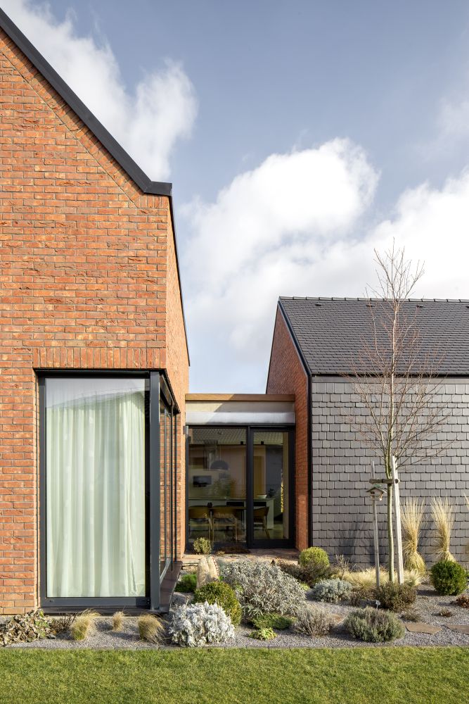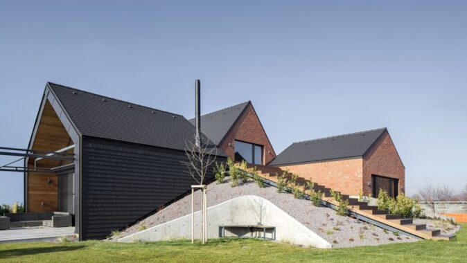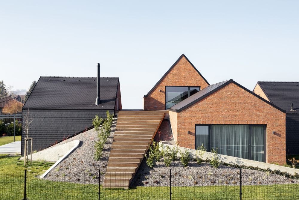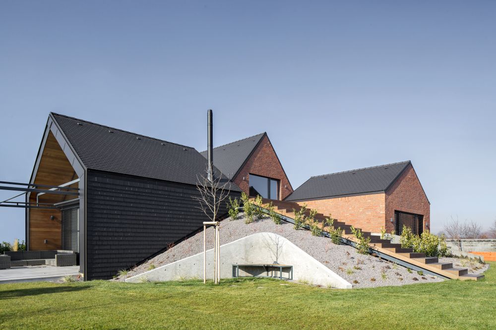 Kompozícia štyroch objemov domu a piateho neviditeľného je zdanlivo nekompaktná, akoby zložená so samostatných rodinných domov. Landscapová architektura „ukrýva“ piatu – centrálnu časť pôdorysu pod umelo vytvorenou terénnou vlnou, obohacujúc rovinaté prostredie.  Samostatne stojace menšie objemy evokujú tradičnú drobnú vidiecku zástavbu, čo je snaha o zachovanie kontinuity s tradíciou.