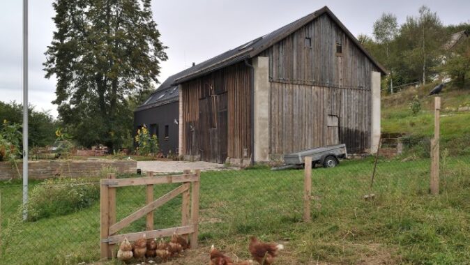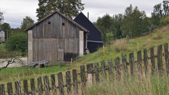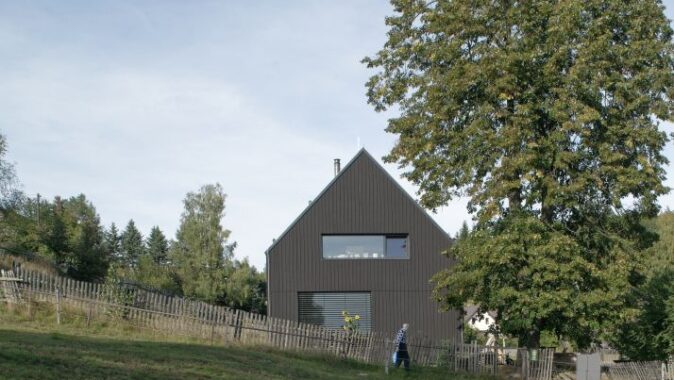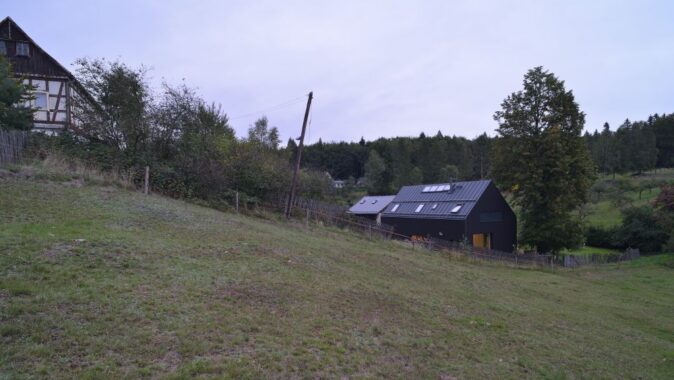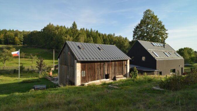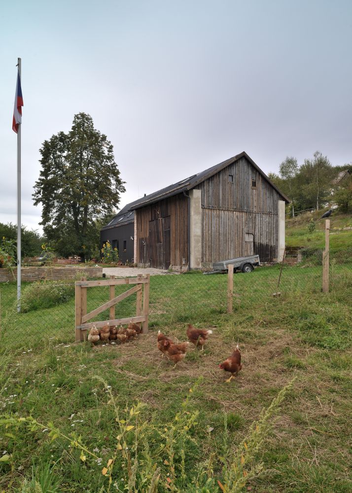 Oproti krásným, ale stále vlhkým masivním pískovcovým stěnám a malým místnostem mezi nimi, nám konstrukce ze současných materiálů umožnily vytvořit relativně velkorysé a dle potřeby otevřené prostory v objemu a proporcích podobných původnímu domu. Dřevěná, pohltivě monochromatická kůže domu příbuzná plášti stodoly, je klidným pozadím proměnlivě barevných dějů kolem.