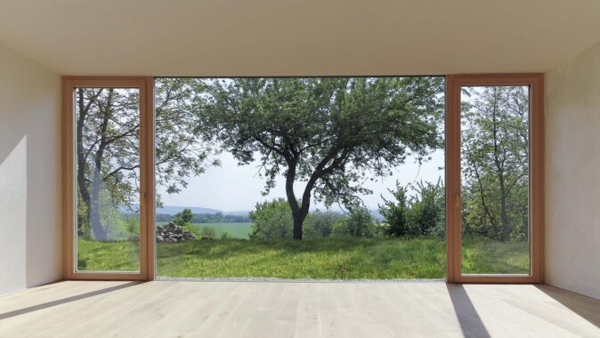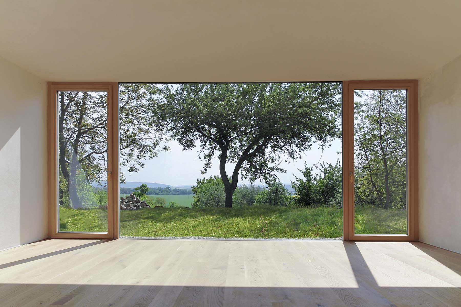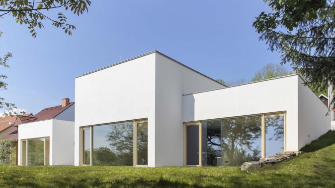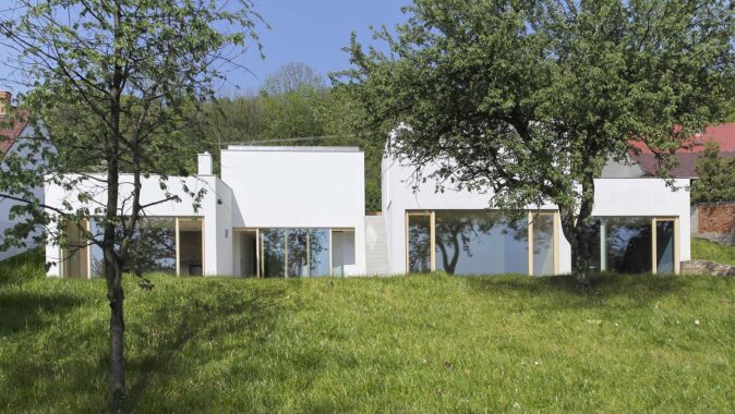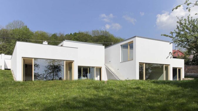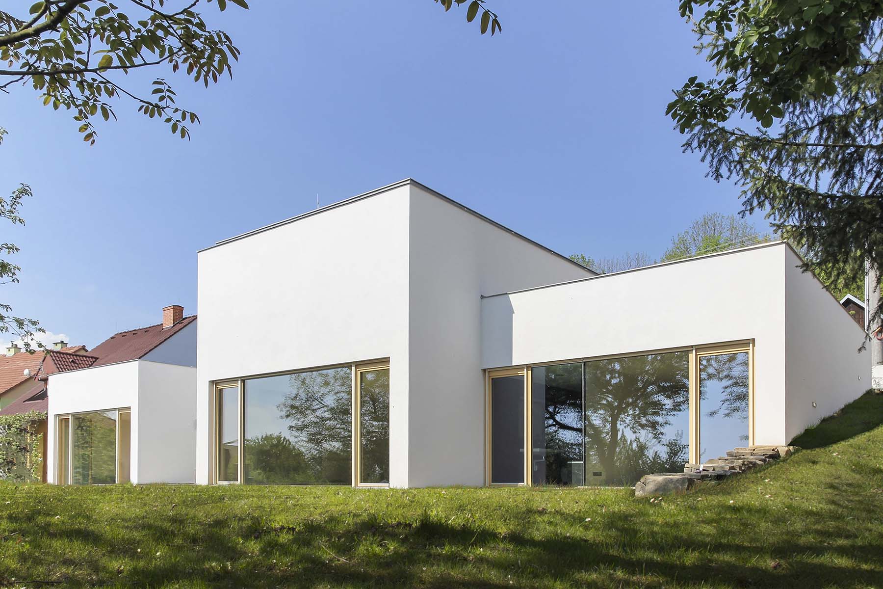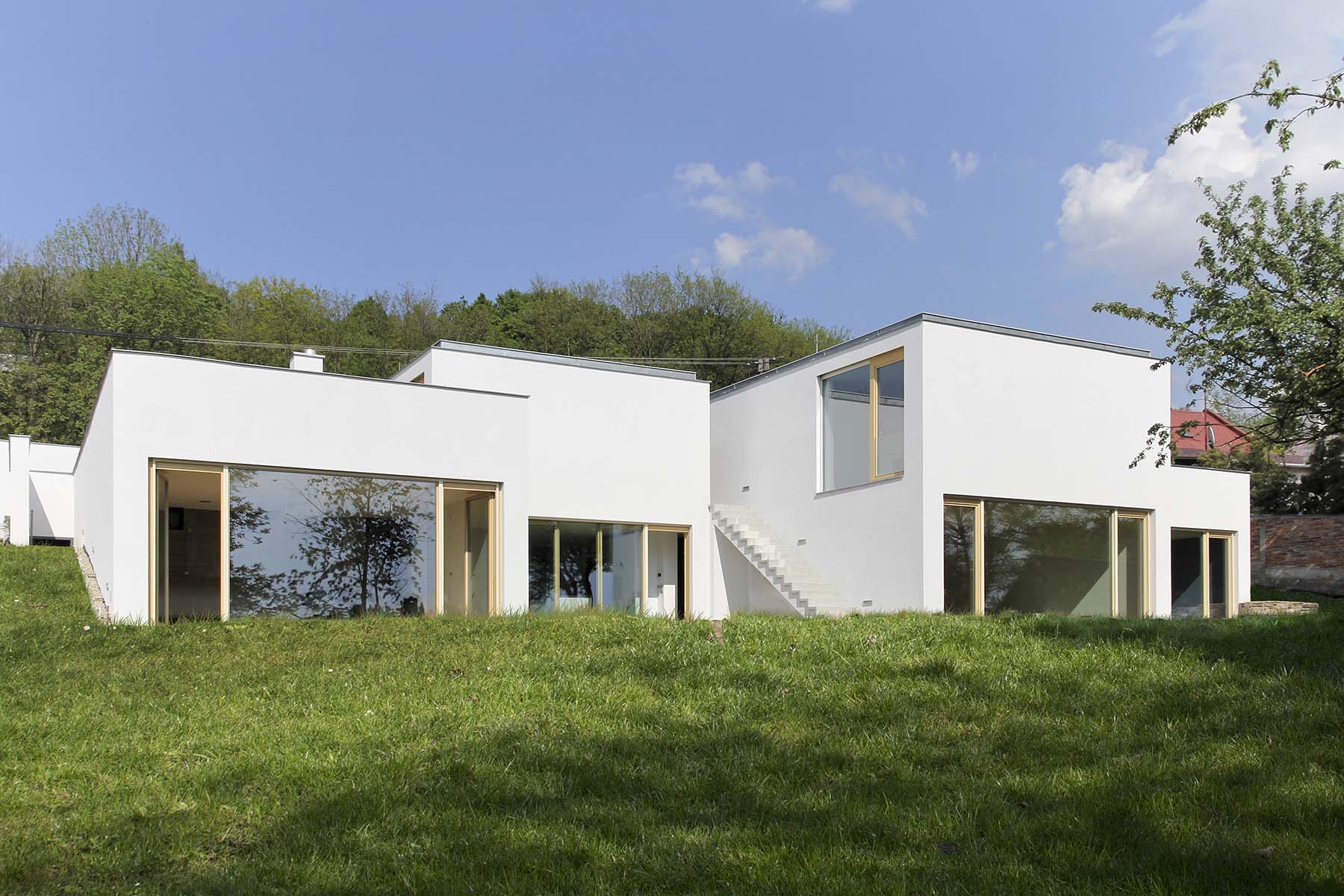 Parcela se nachází ve střední části obce Přílepy.Jedná se o obdélníkový pozemek, svažující se jihozápadním směrem, s příjezdem podél severovýchodní hranice parcely. Rozložení provozu domu je do dvou výškových úrovní. Nástupní podlaží, navazující na niveletu komunikace, sestává z dvou oddělených hmot. Protáhlého traktu krytého stání, na které navazuje prostor skladu zahradní techniky a nábytku doplněný o saunu se zázemím a fitness a samotný vstup do domu se šatnou, pracovnou a hygienickým zázemím, umístěný proti vjezdu na pozemek. Hlavní, obytné podlaží dostupné vnitřním jednoramenným schodištěm zabírá takřka celou šířku pozemku a je rozložené do několika vzájemně propojených objemů vymezujících prostor terasy. Střed kompozice tvoří kuchyň s jídelnou, na kterou navazuje terasa, doplněná o venkovní schodiště propojující obě úrovně domu. Obývací pokoj vymezuje venkovní posezení ze západu, soukromá část s ložnicí rodičů, dětským pokojem a koupelnou je situovaná ve východní části parcely. Technické zázemí domu je umístěno vedle kuchyně. Původní zachovaný sklep v severním rohu parcely je překryt zeminou a doplněn o venkovní schodiště navazující na severozápadní hranu domu.