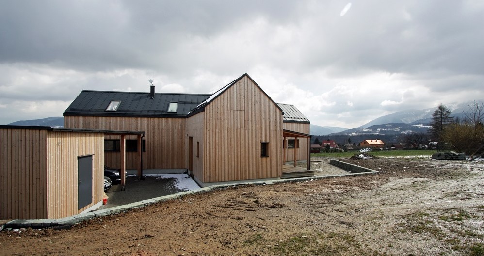 Máme za to, že symbolickým středem rodinného života, místem, kde se schází rodiče s dětmi a vítají se hosté, je jídelní stůl. Proto také zaujímá centrální pozici největšího prostoru domu s převýšením do krovu mezi kuchyní a obývacím pokojem – ostatní části domu jsou rozděleny patrem. Obývacímu pokoji s krbem vládne veliké fixní okno bez rušivých profilů, nabízející výhled na Beskydy a zvyšující společenský charakter místa, kde nebyla umístěna televize, protože by tu rušila. Pro ni jsme vyhradili koutek na galerii nad kuchyní, odkud se vchází do pracovny. Zařízení kuchyně je pojato střízlivě s velkým pultem. Nad jídelním stolem je ze stropu, modelovaného dřevem, zavěšeno výrazné černé světlo.