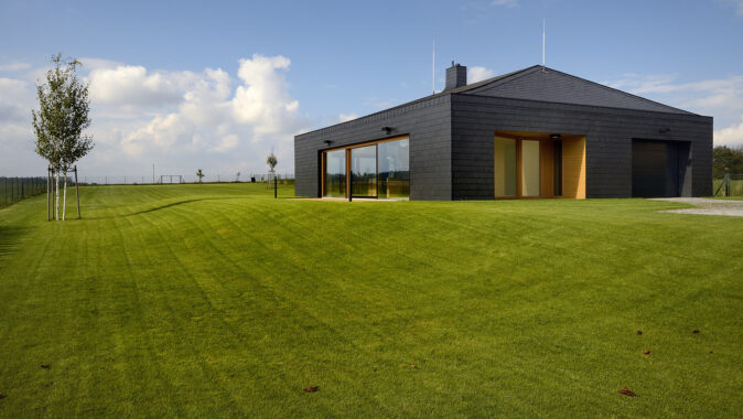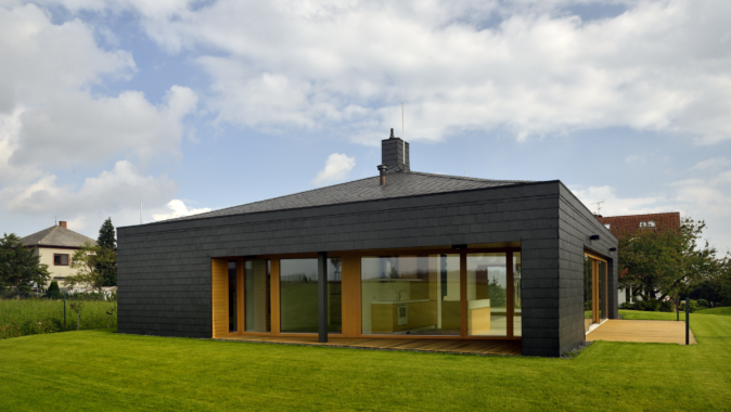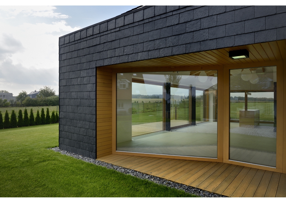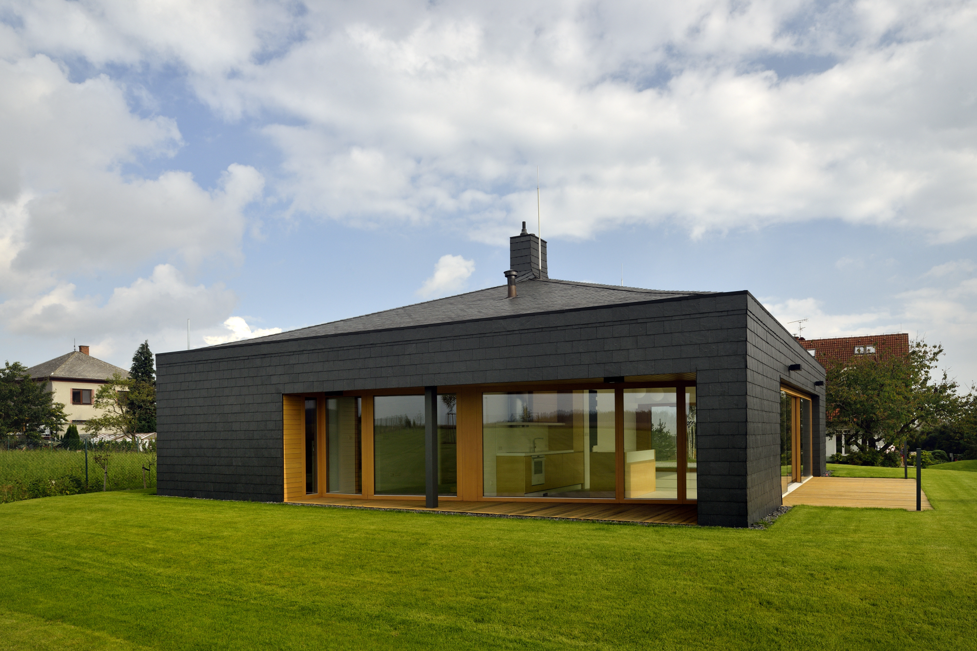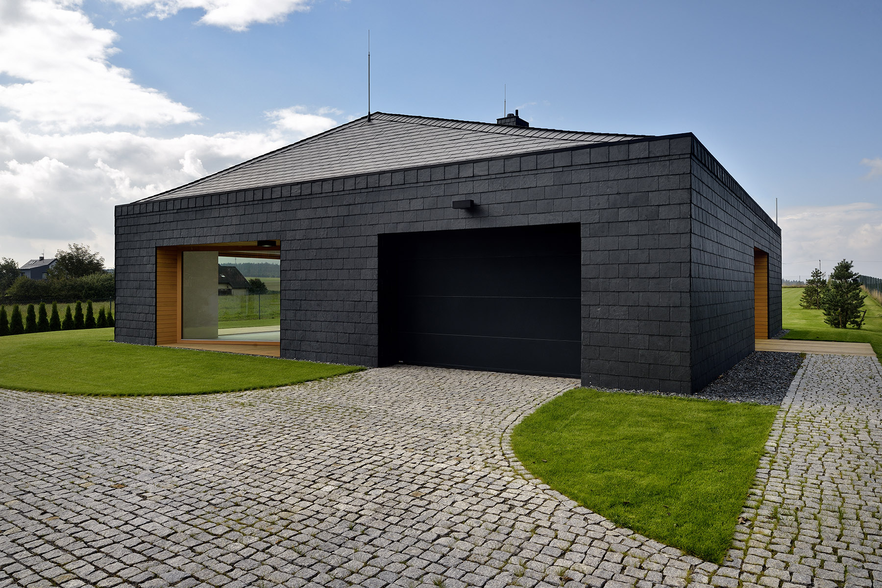 Břidlice je sice krásný materiál, ale koncept se mezi rodinnou zástavbu moc nehodí, evokuje svojí zdánlivou ponurostí trochu i hřbitovní stavby. Strohý dojem umocní i sám tvar, ještě že to není krabice, to jest dnešní stodolový trend. Udivuje mne , že takto chce někdo bydlet.