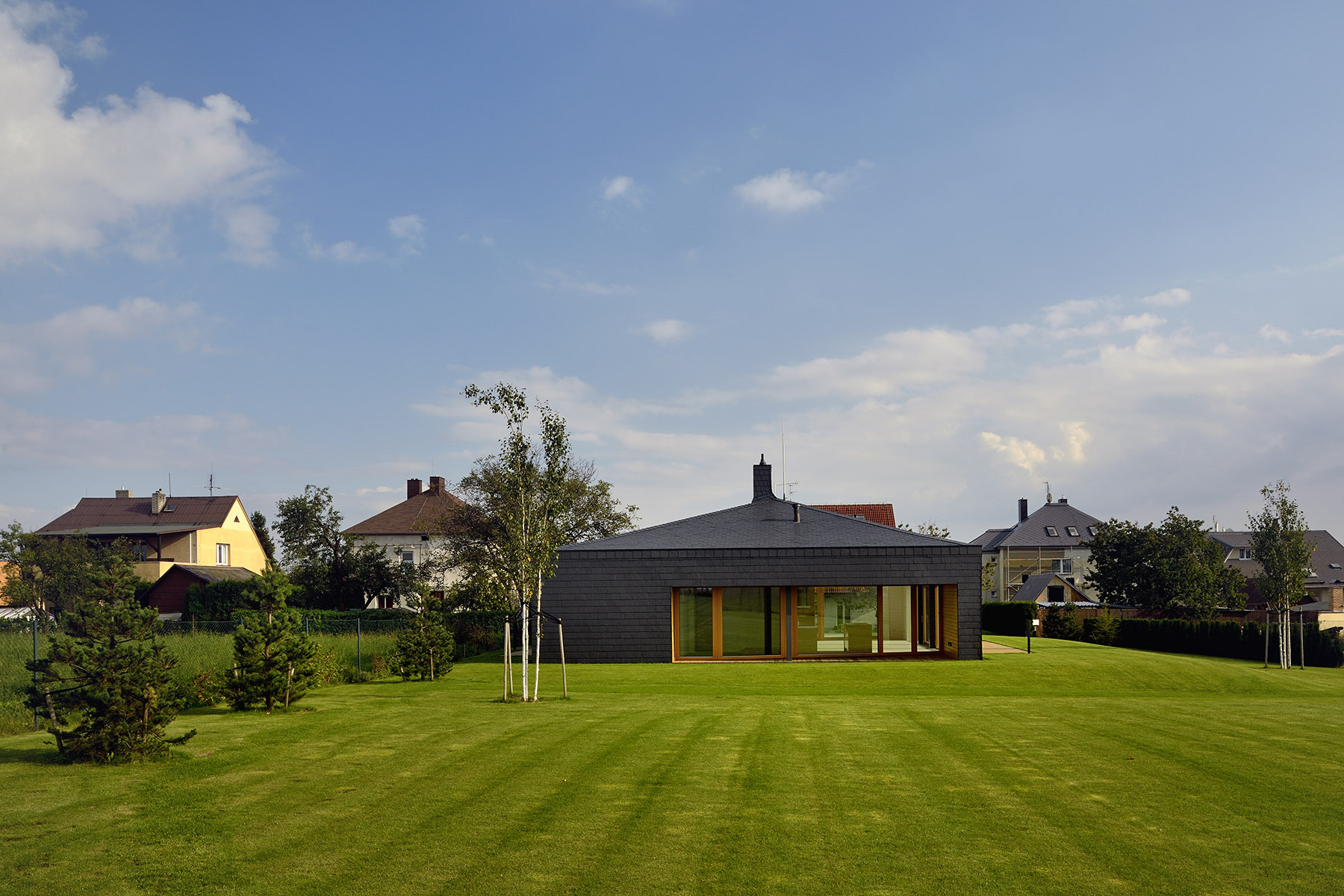 Rodinný dům je navržen jako jednopodlažní, s šikmou valbovou střechou mírného sklonu. Kompaktní hmota domu působí jako mnohostěnný krystal. Výrazným principem jsou „vykousnuté“ šikmé terasy, které umocňují vazbu mezi domem a exteriérem. Dům prostřednictvím prosklených ploch komunikuje se všemi světovými stranami.