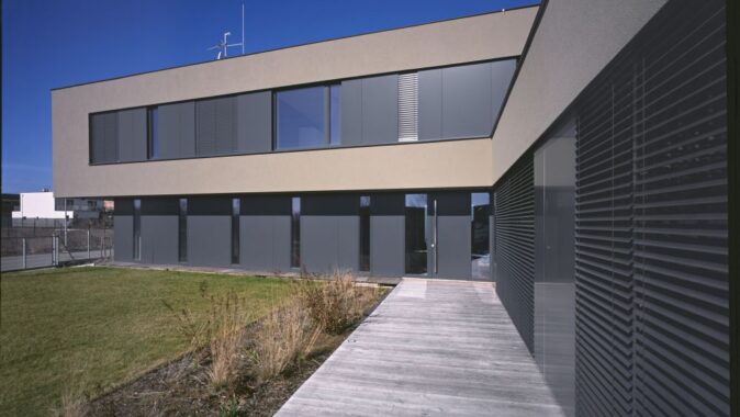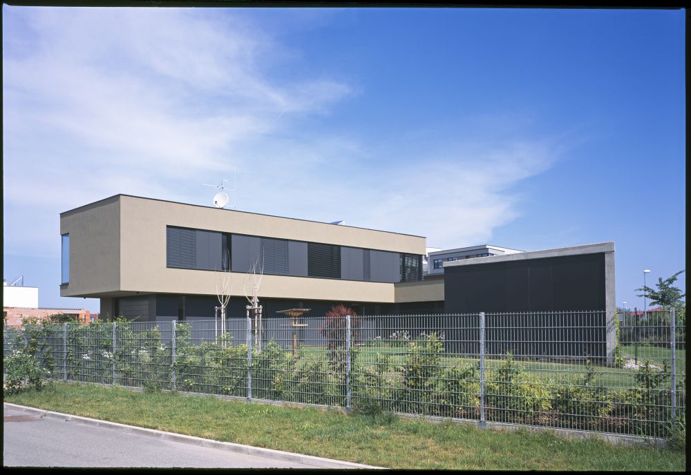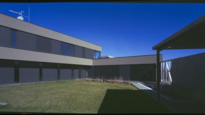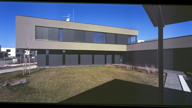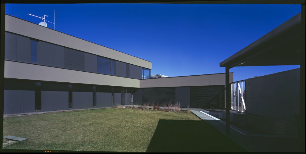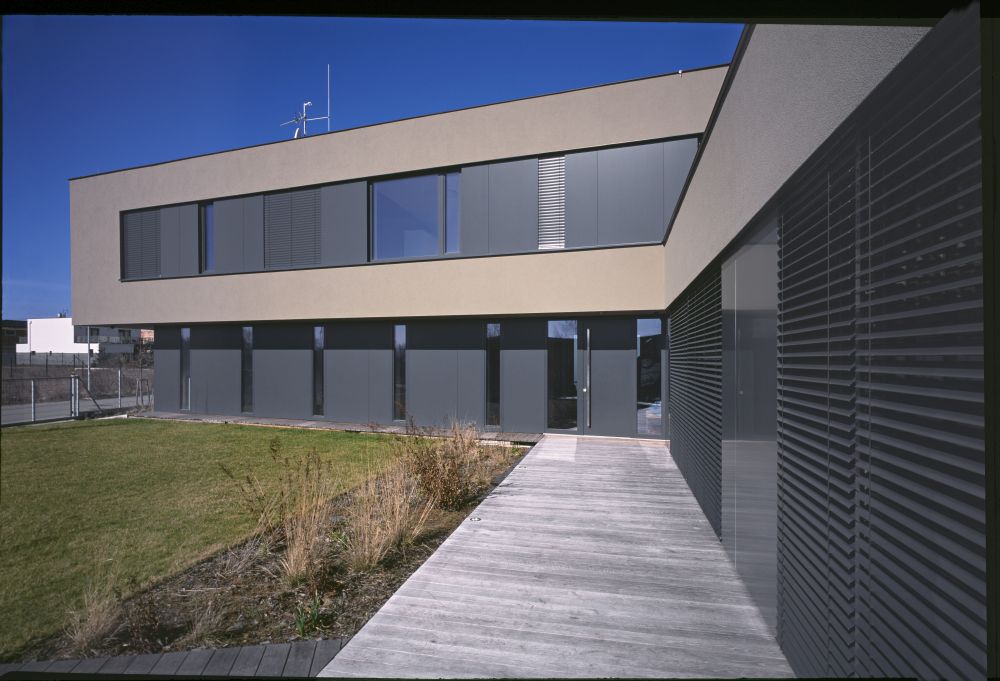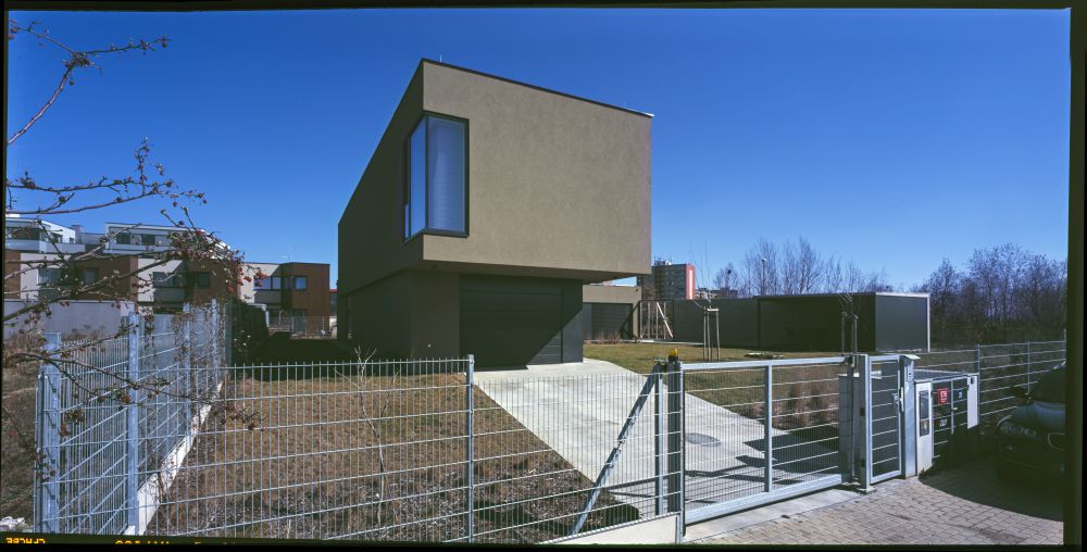 Hmotu stavby lze popsat jako dvě na sobě položené horizontální hmoty. Hmota 1. NP ve tvaru písmene L, obsahující garáž, technické zázemí, vstupní a společenskou část domu, je umístěna co nejblíže k západní a severní hranici parcely tak, aby na jižní straně vznikl prostor pro pobytovou zahradu. Východní část dvora tvoří zeď, k níž jsou přidruženy bazén, altán a sklad nářadí. Soukromá část domu s ložnicemi, umístěná ve hmotě 2. NP, se vznáší nad západním křídlem 1. NP. Její okna jsou orientována převážně na východ do zahrady. Kompozice dvou základních horizontálních hmot tak jednoznačně vyjadřuje diferenciaci domu na společenskou a soukromou část.
