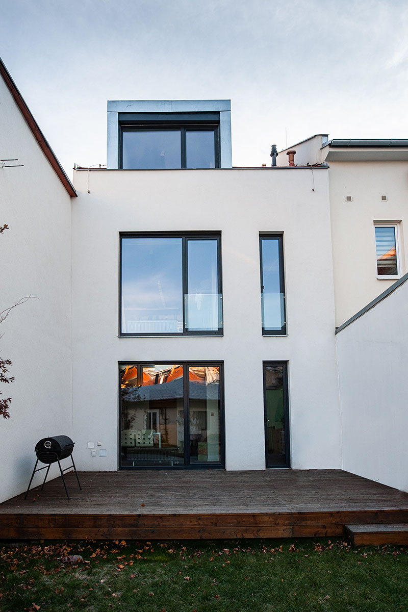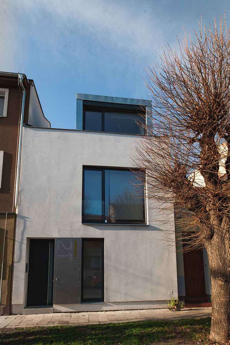Rekonstrukce řadového rodinného domu s terasou a malou zahrádkou v klidné slepé ulici v Brně.Původní přízemní domek se sedlovou střechou byl nahrazen částečně podsklepeným objektem se dvěma nadzemními podlažími a podkrovím.