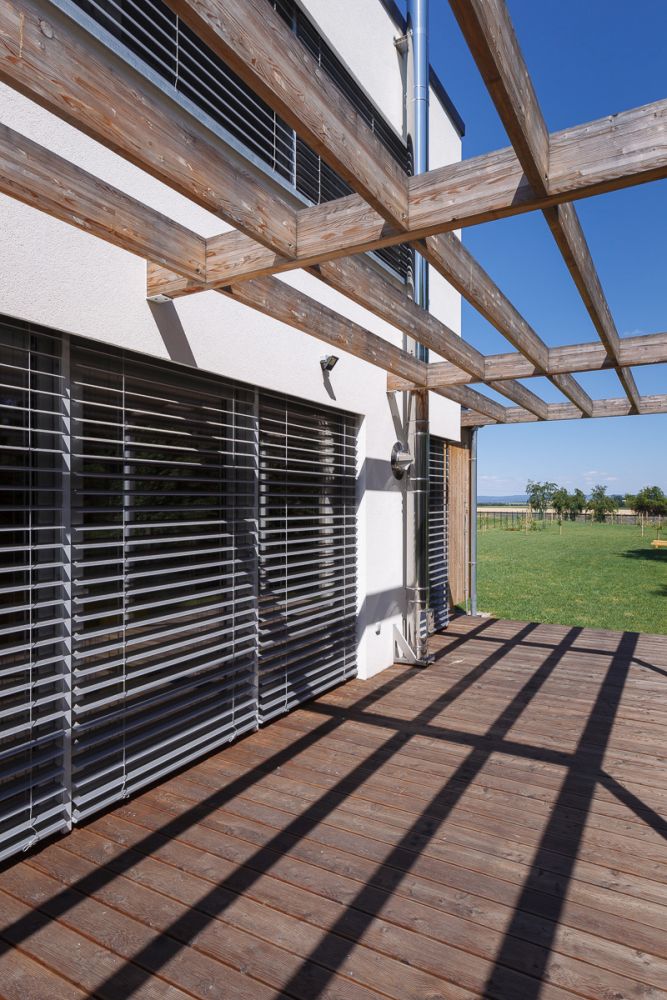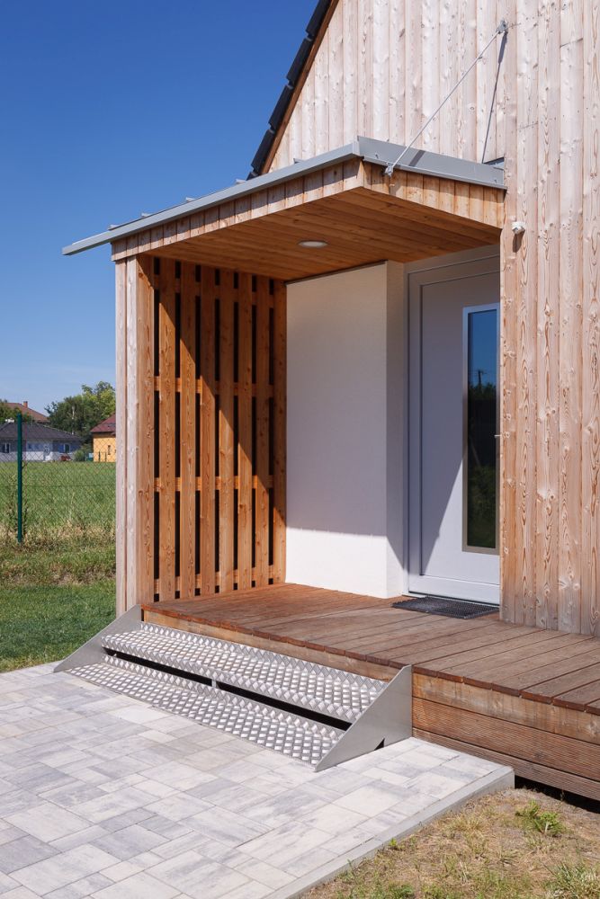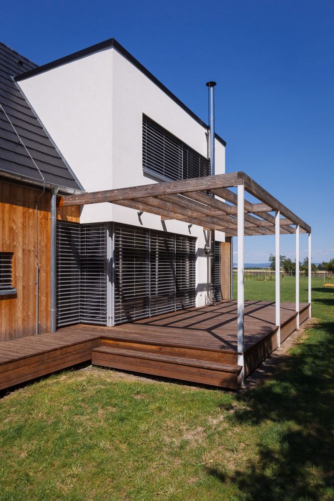 Dřevostavba byla vybudována v přední třetině podlouhlé parcely. U vstupu/vjezdu na pozemek je umístěné kryté parkovací stání se skladem na nářadí. Obdélníkový půdorys domu reaguje na tvar pozemku, jeho podélná osa je orientovaná ve směru západ–východ. Stavba byla inspirována tradičními chalupami, pro ráz obce představuje vysokou přidanou hodnotu. Základním archetypálním tvarem hmoty se strmější sedlovou střechou prostupuje hranol, kterým je na jihu rozšířená společenská část domu v přízemí a v podkroví vytvořený vikýř. Na severní straně je mělký vikýř pro prostor schodiště a koupelny. Materiálové řešení: přírodní dřevěný obklad, bílá omítka, antracitová barva střechy a světle šedé okenní rámy.
