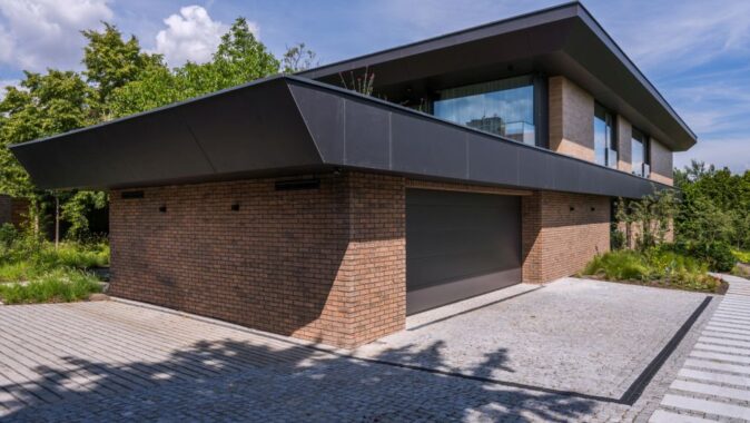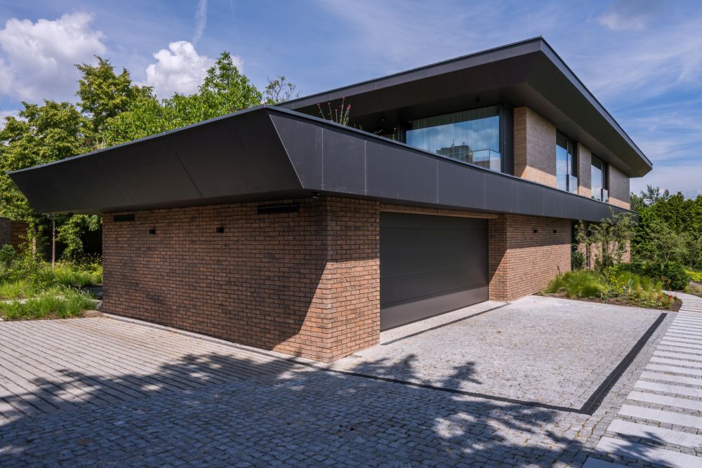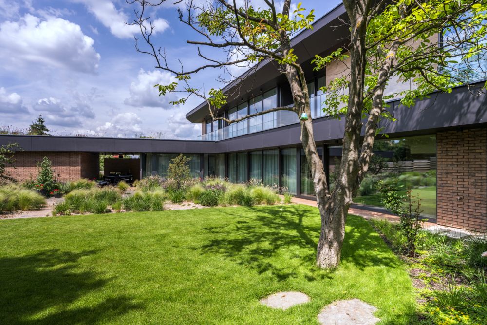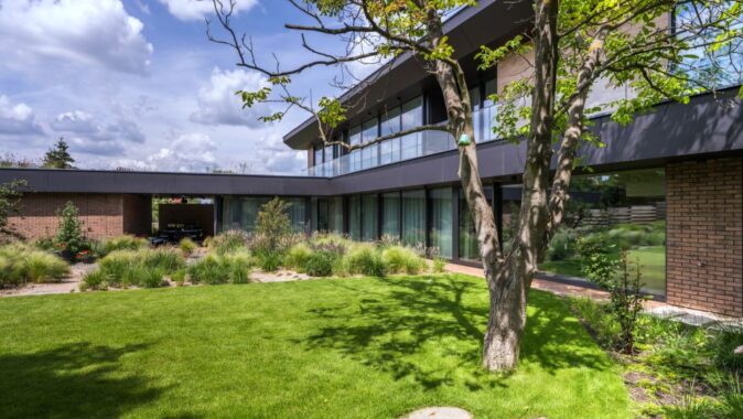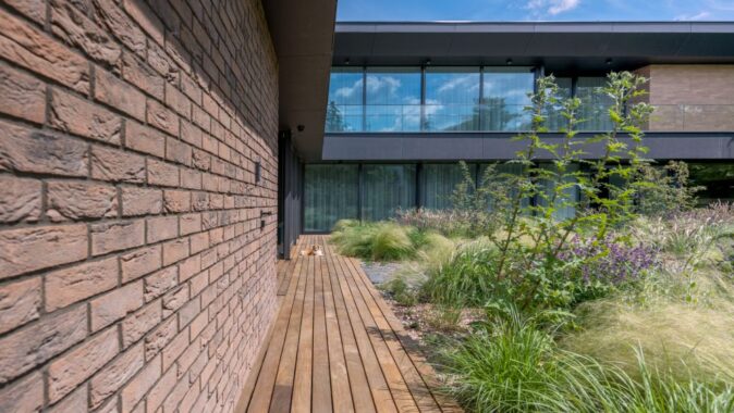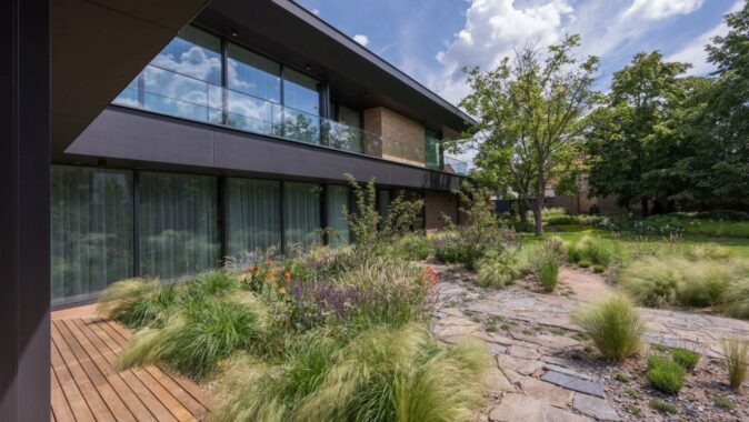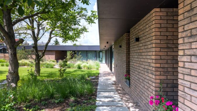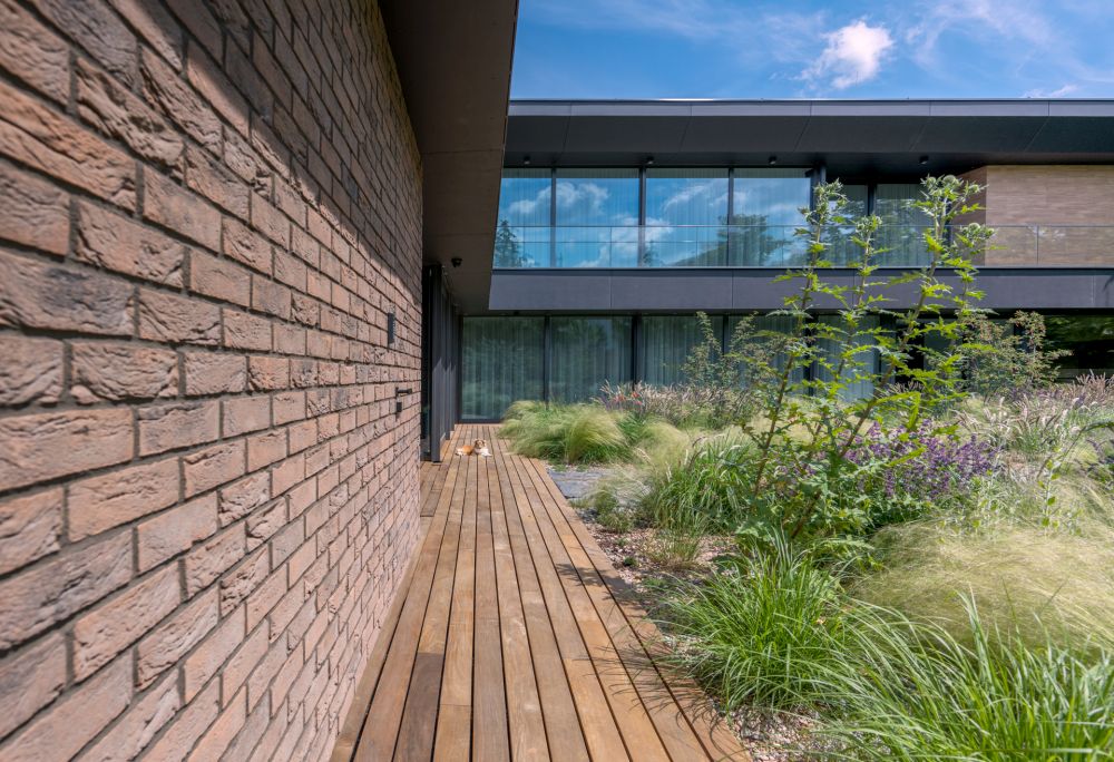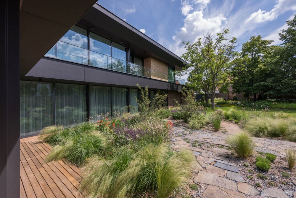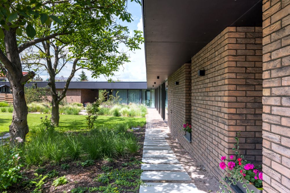 Pozemek má téměř trojúhelníkový tvar. Dům kopíruje dvě hrany pozemku a vytváří tak linie písmene L. Tvar stavby poskytl prostor pro zahradu.