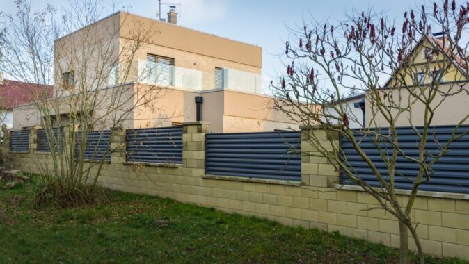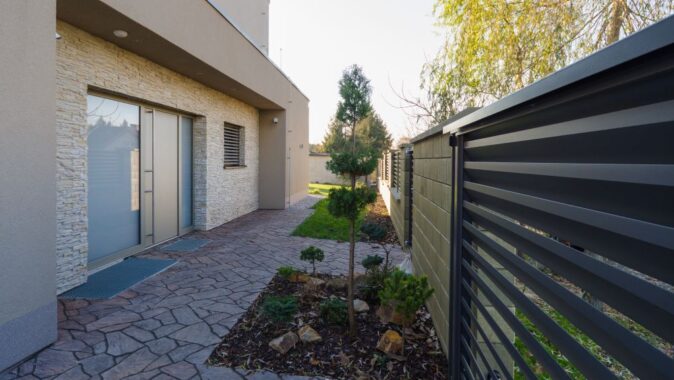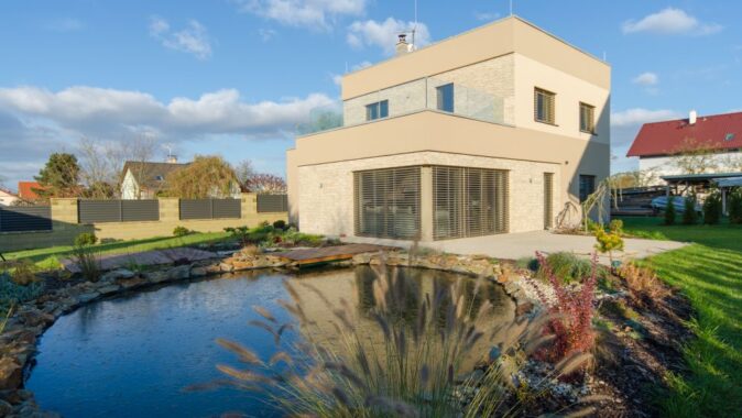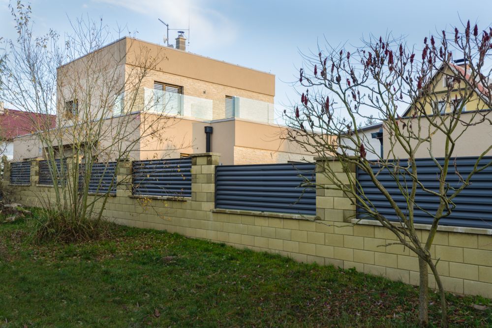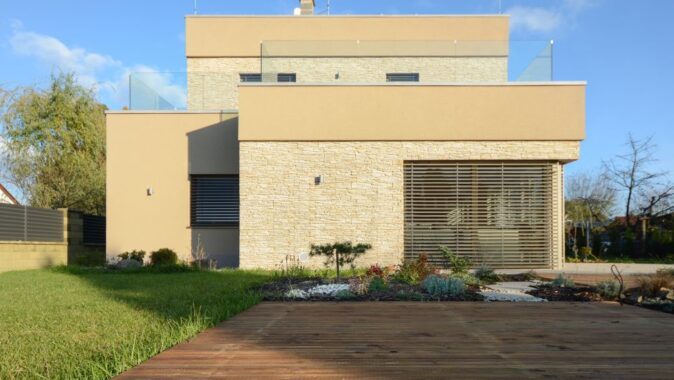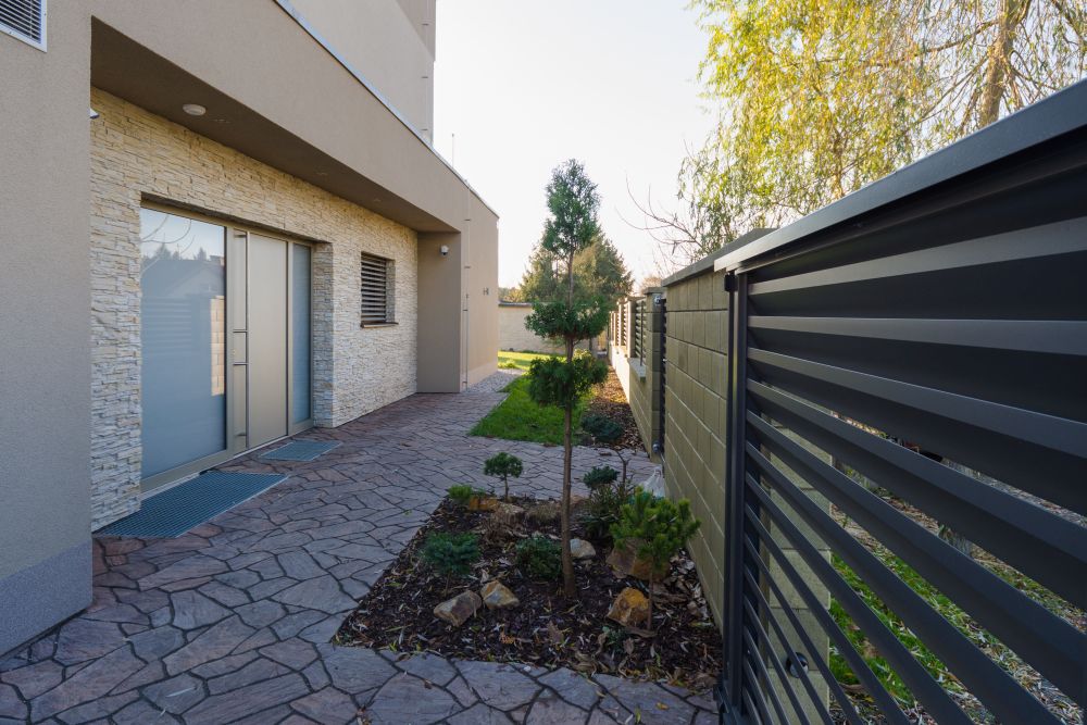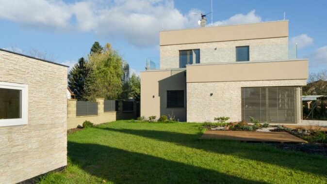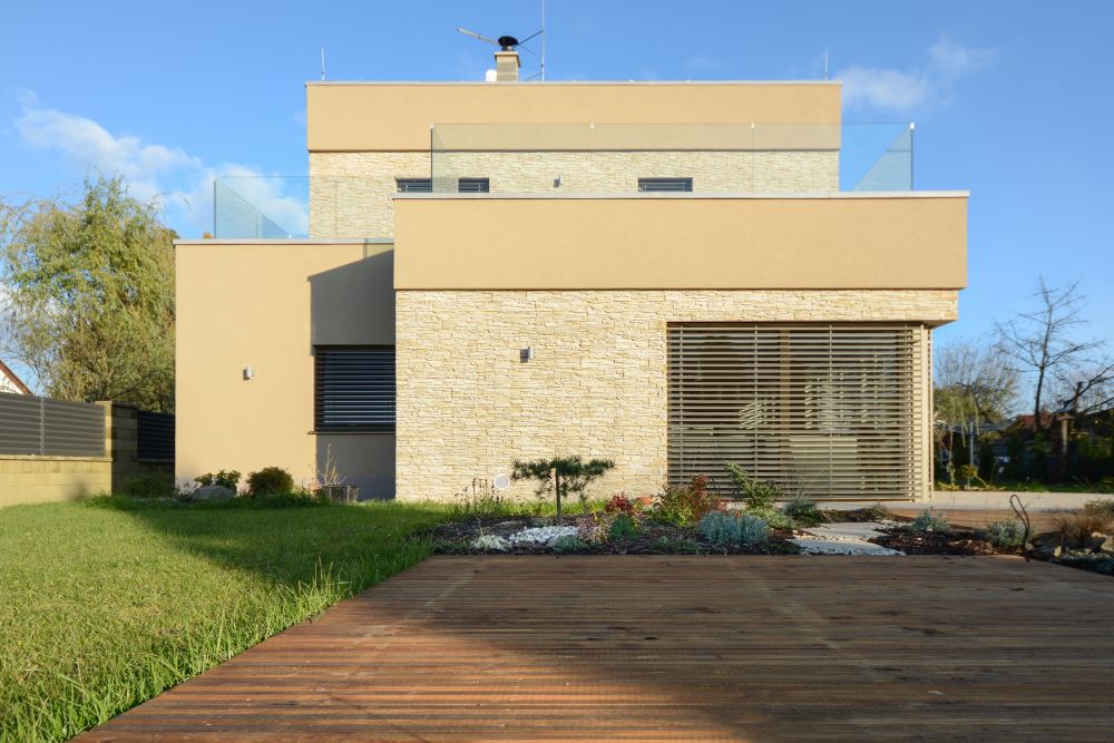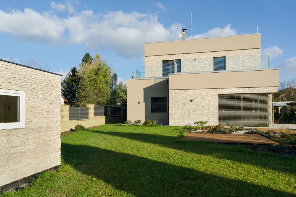 kamenným obkladem. K rodinnému pasivnímu domu přiléhá nepasivní část
