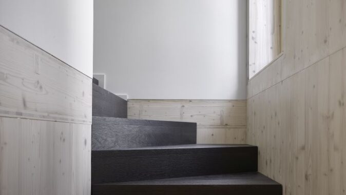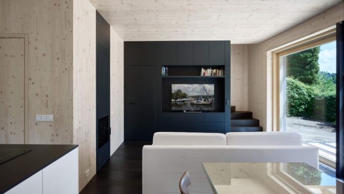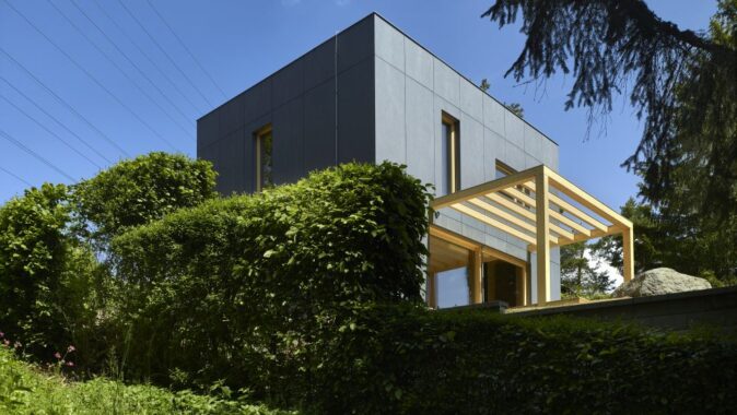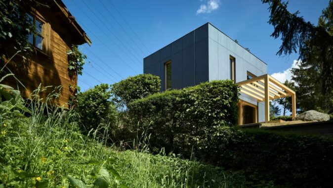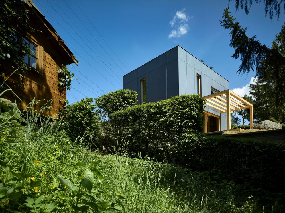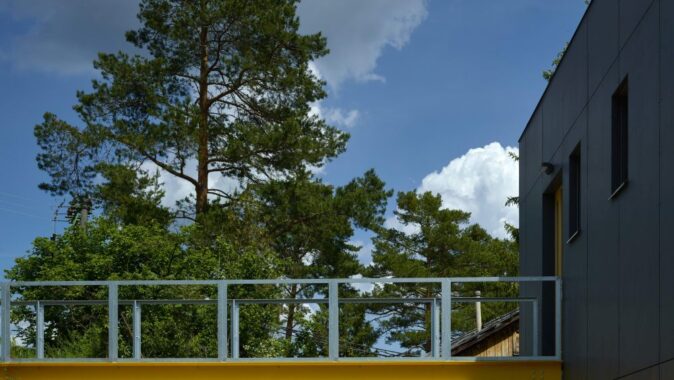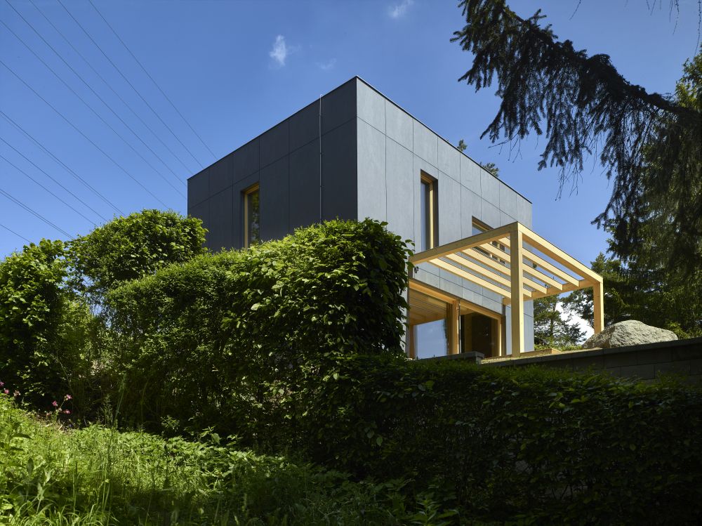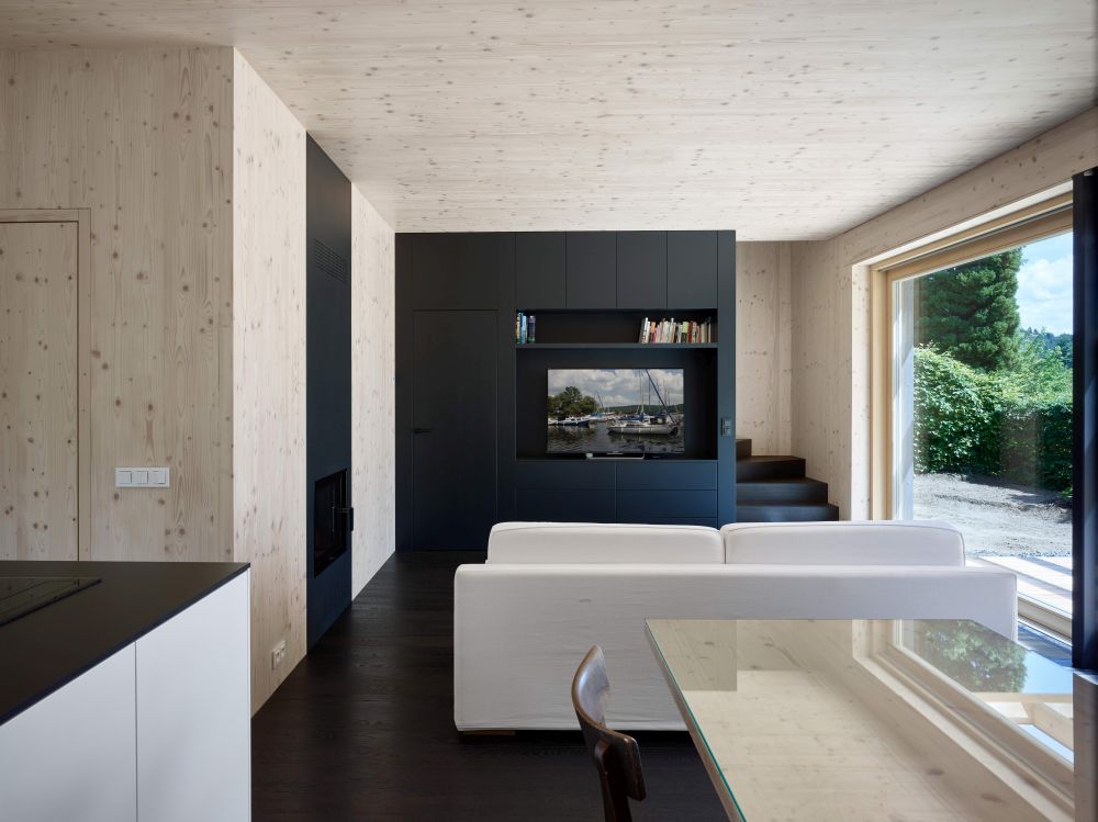 Konstrukci domu tvoří masivní dřevěné panely s tepelnou izolací minerální vatou a provětrávanou mezerou za velkoformátovým obkladem z cementovláknitých desek. S antracitovým odstínem fasády kontrastuje světlé dřevo okenních rámů a pergoly, stejně jako žlutý lak ocelové lávky. Výraz interiéru udávají především přiznané smrkové panely.
