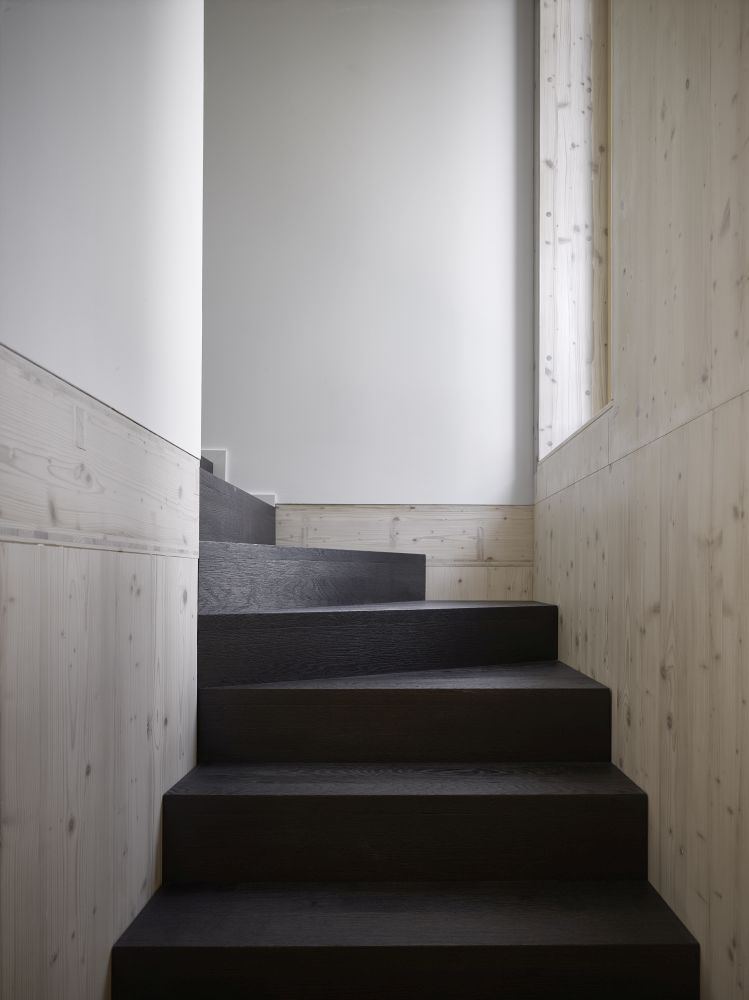 spojuje lávka. Ze zádveří sestupuje schodiště do obytného prostoru s kuchyní,
