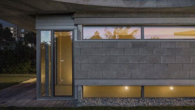 Přízemní dům je realizován ze ztraceného bednění v exteriéru pohledového, uvnitř byl obložen vrstvou překližky. Střecha je ze železobetonu s hydroizolační stěrkou na bázi cementu, podlahy jsou uvnitř polyuretanové.