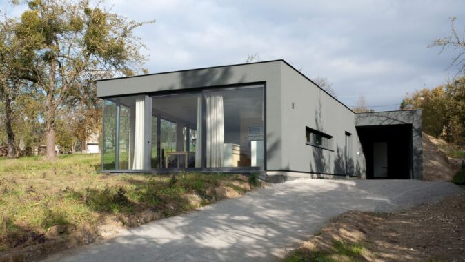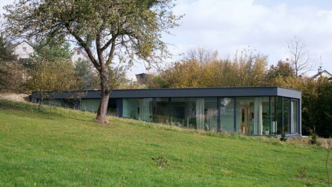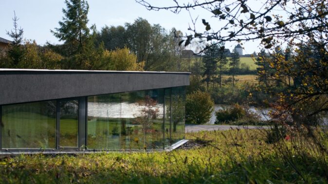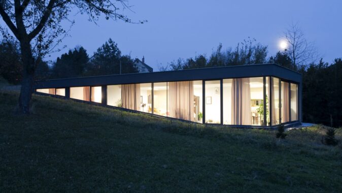 aby splynul se svým okolím. Svah pozemku pozvolna přechází na zelenou střechu
