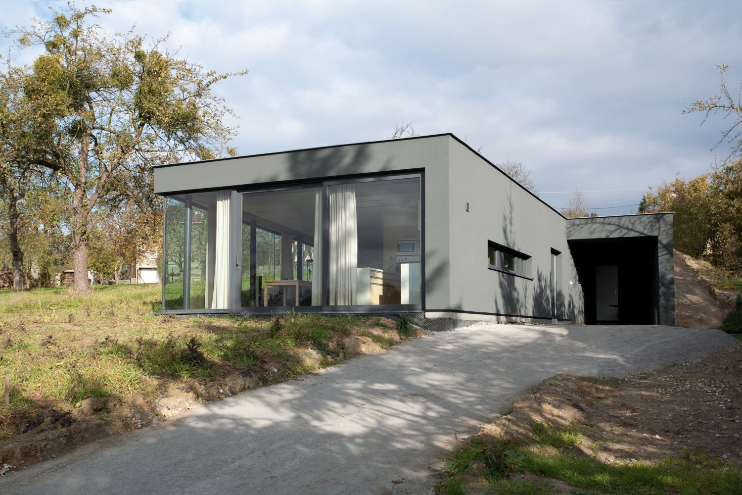 Návrh vychází z konkrétního místa – svažitý pozemek na konci