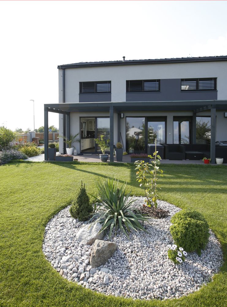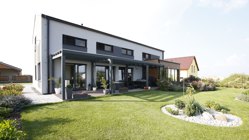 Zastavěná plocha: 232,32 m2, kryté parkovací stání a závětří 40,5 m2, terasa 32 m2