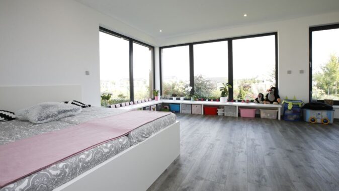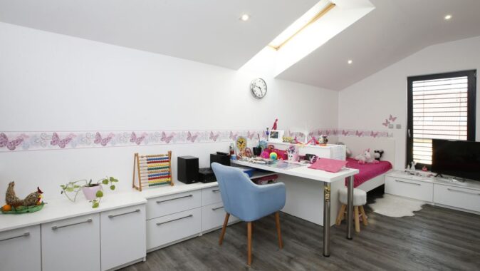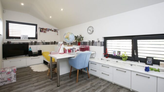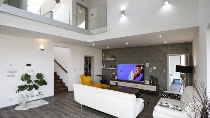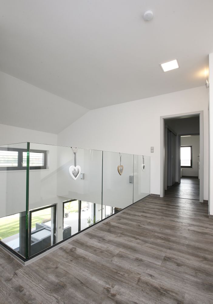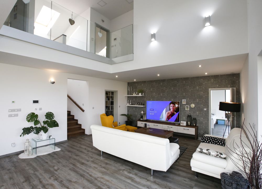 V 1. NP se nachází zádveří s šatnou, technická místnost, obytný prostor, spíž, pracovna se šatnou, herna, koupelna a schodiště. Z obývacího pokoje se vchází na terasu. Ve 2. NP je klidová zóna – skleněná galerie, dva pokoje s šatnami, ložnice s šatnou a chodbou, dvě koupelny. Prostor mezi dětskými pokoji byl rozdělen tak, aby každé z dětí mělo svoji šatnu přístupnou ze svého pokoje. Manželé pak mají svoji vlastní šatnu vedle ložnice.