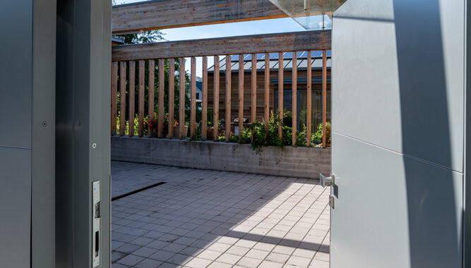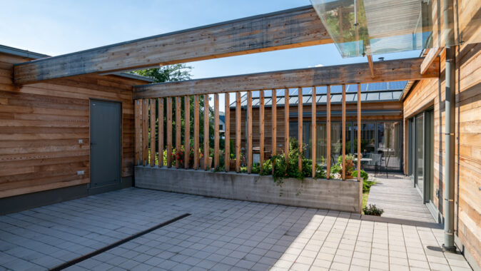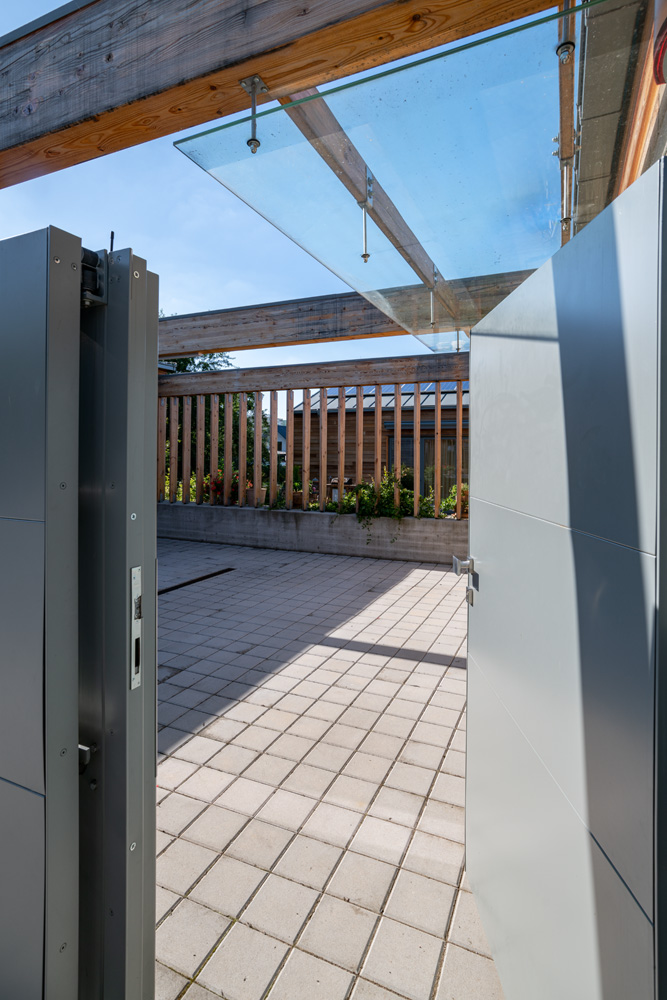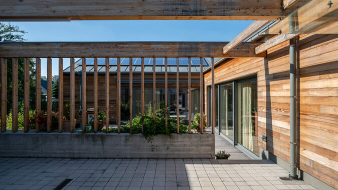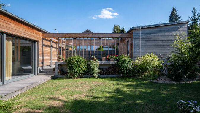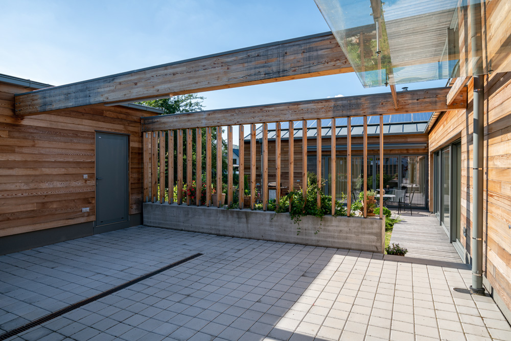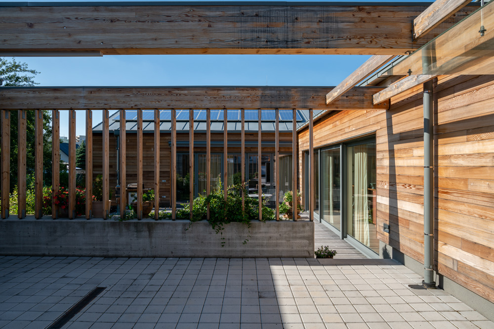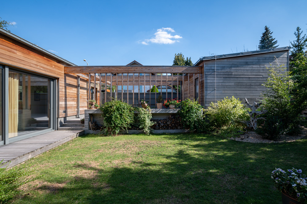 Pobytová zahrada domu je vytvořena v jeho středu. Navazují na ni hlavní obytné