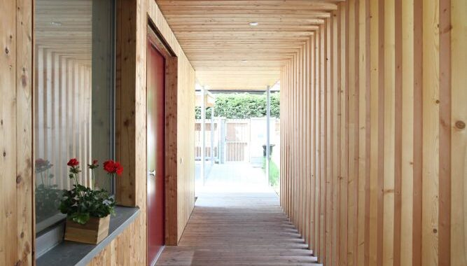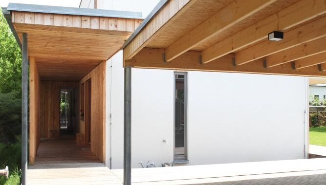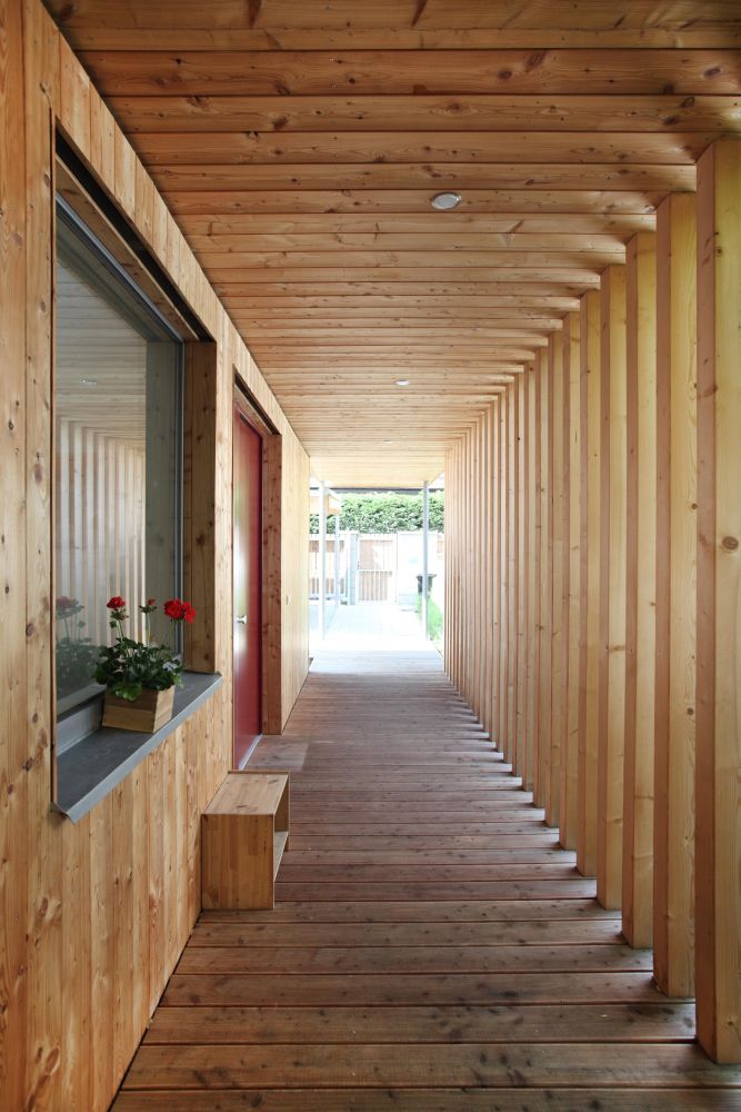 Zachování intimity interiéru a respekt k soukromí sousedů uzavírá stavbu ze tří stran. Naopak svou jihovýchodní stranou se vila otevírá všemi obytnými místnostmi. Stala se tak součástí zahrady, která volně přechází přes venkovní obytný prostor pod vykonzolovaným patrem do interiérů.