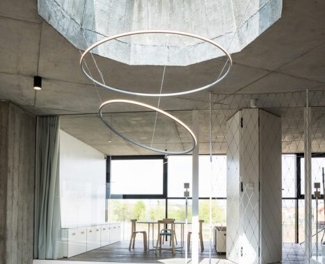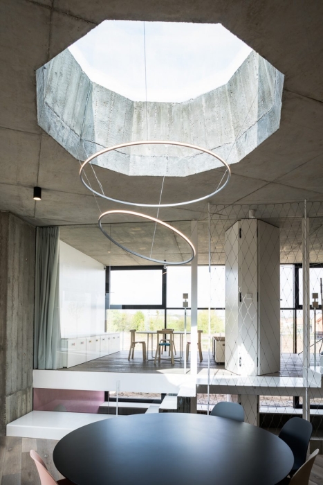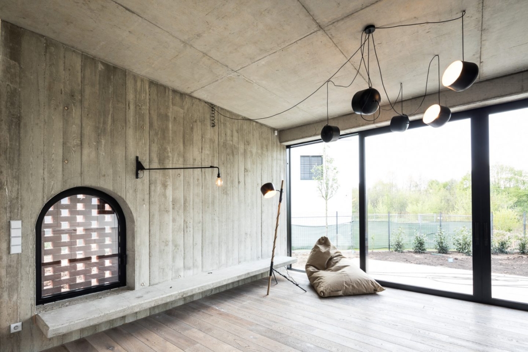 Koncept domu je postaven na různorodosti podnětů klienta a okolí. Pro sousedy je dům tvarově čistý, přízemní a s plochou střechou. Pro rodinu vytváří prostorový zážitek. Východiskem pro návrh byl požadavek centrálního prostoru – srdce domu. To vzniklo ve středu tří do trojúhelníku semknutých funkčních bloků. Bloky jsou členěny následovně: Vstupní dvoupodlažní blok s ložnicí rodičů v přízemí, šatnou, koupelnou a technickým zázemím v suterénu, do krajiny otevřený blok obývacího pokoje a kuchyně a průhledný dvoupatrový blok se čtyřmi dětskými pokoji. Ve středu domu je jídelní stůl pod světlíkem.