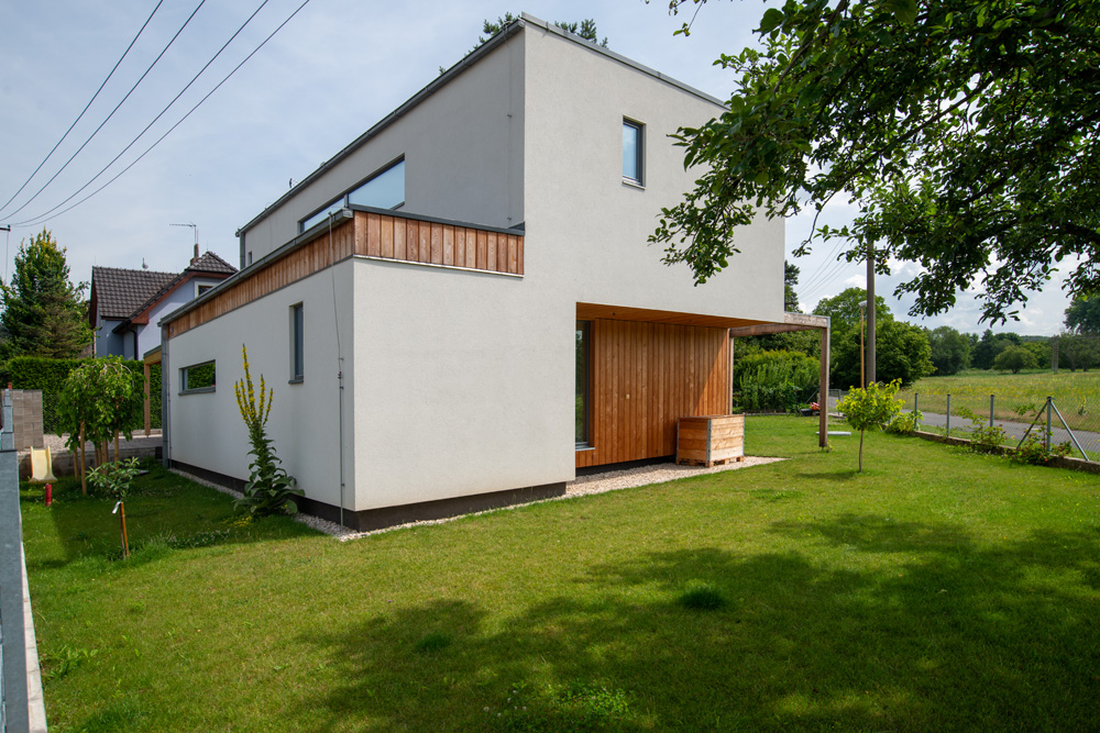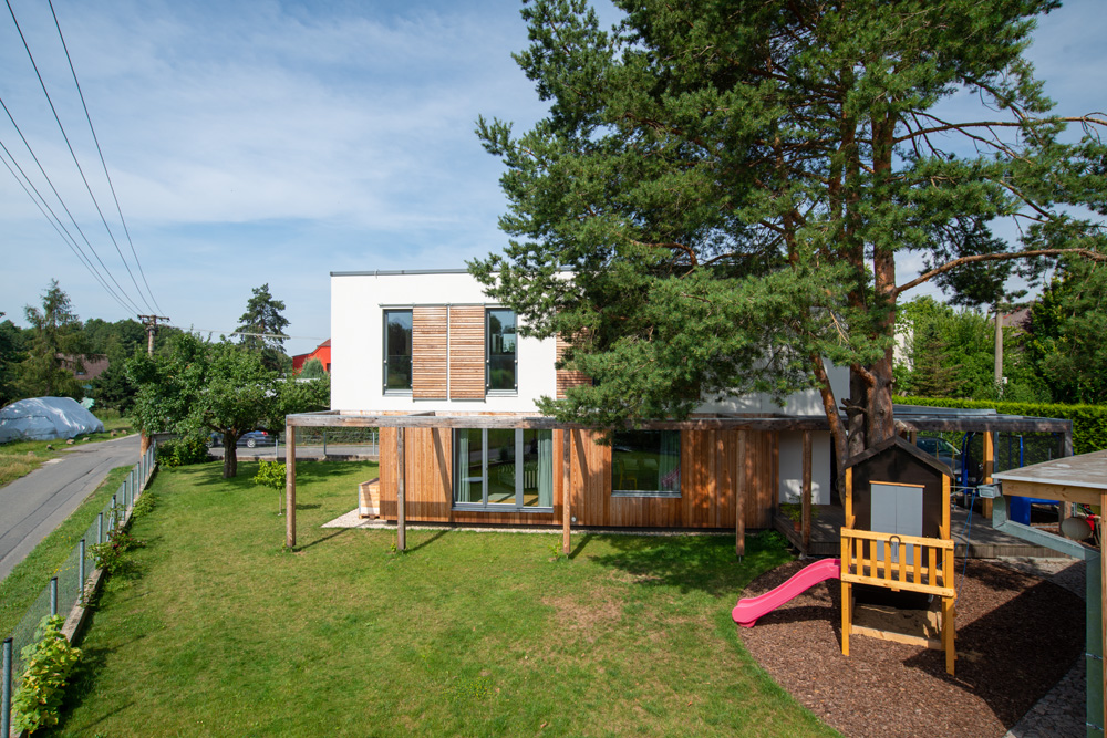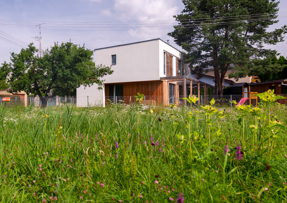 komunikaci. Otevírá se k jihovýchodu do zahrady, čímž dodává interiérům patřičnou intimitu a umožňuje v zimních měsících využití tepelných
