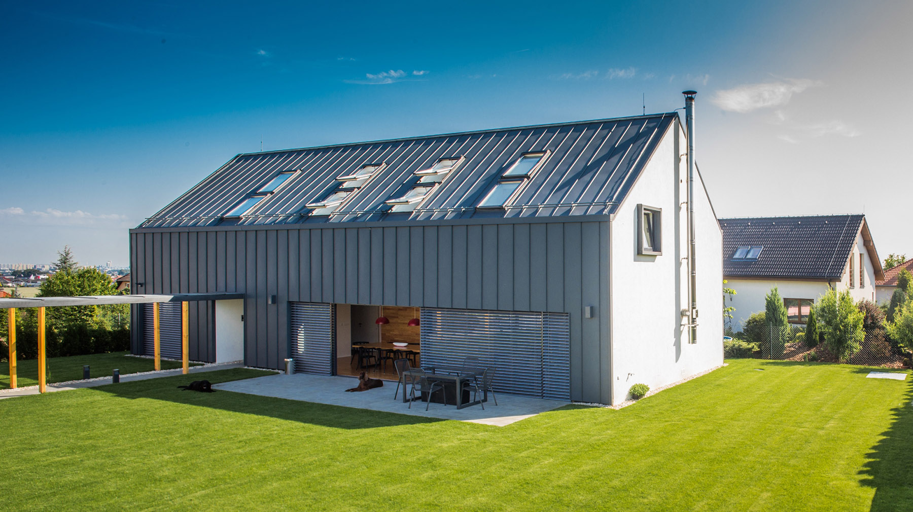 Mladá rodina si pro své bydlení vysnila rodinný dům, který upoutá na první pohled netradičním řešením, bude reprezentativní a přitom funkční. S původním projektem domu byli majitelé nespokojeni, a tak začali spolupracovat s architekty z MIO architects. Ti z dřívějšího projektu zachovali velké prosklení a otevřenou galerii, s nímž skvěle ladí tmavě šedá falcovaná střešní krytina Lindab SRP Click. Aby dům působil kompaktně, je tato krytina využita i na plášť celého domu. Na výraznosti a kontrastu mu dodává kombinace fasády na bočních zdech s bílými štíty, do nichž jsou umístěna okna s výrazným orámováním.
