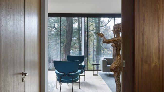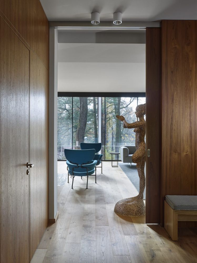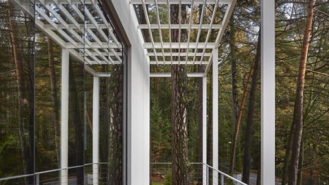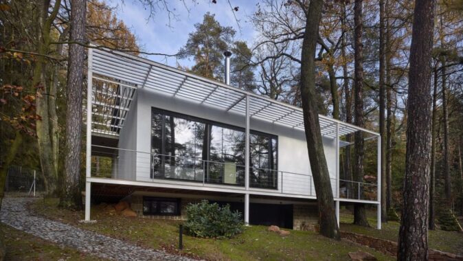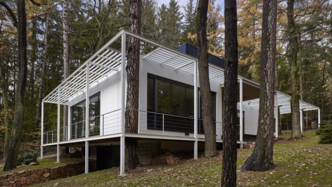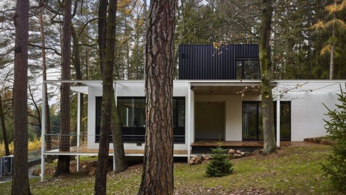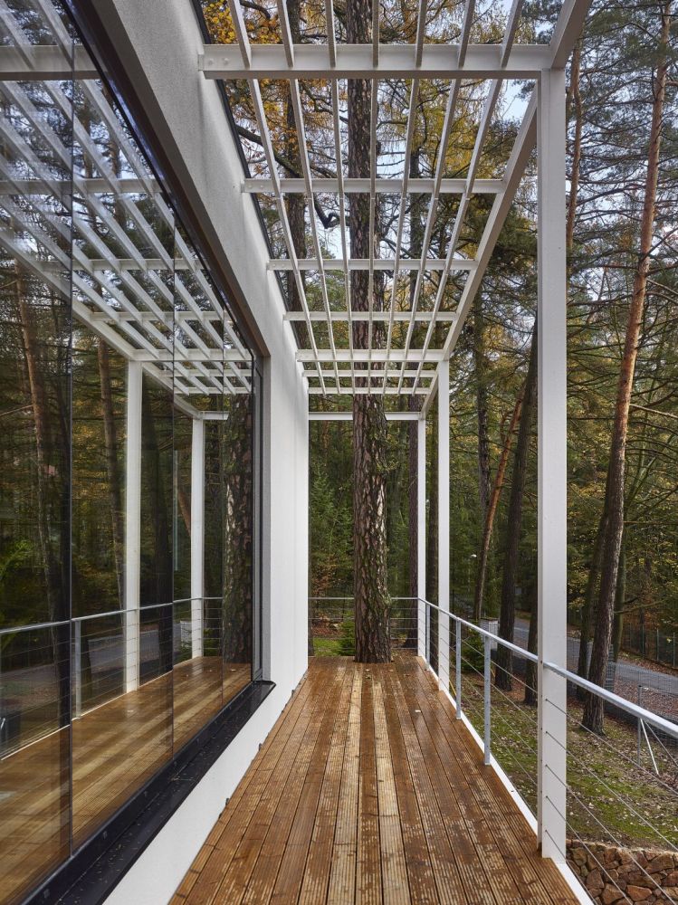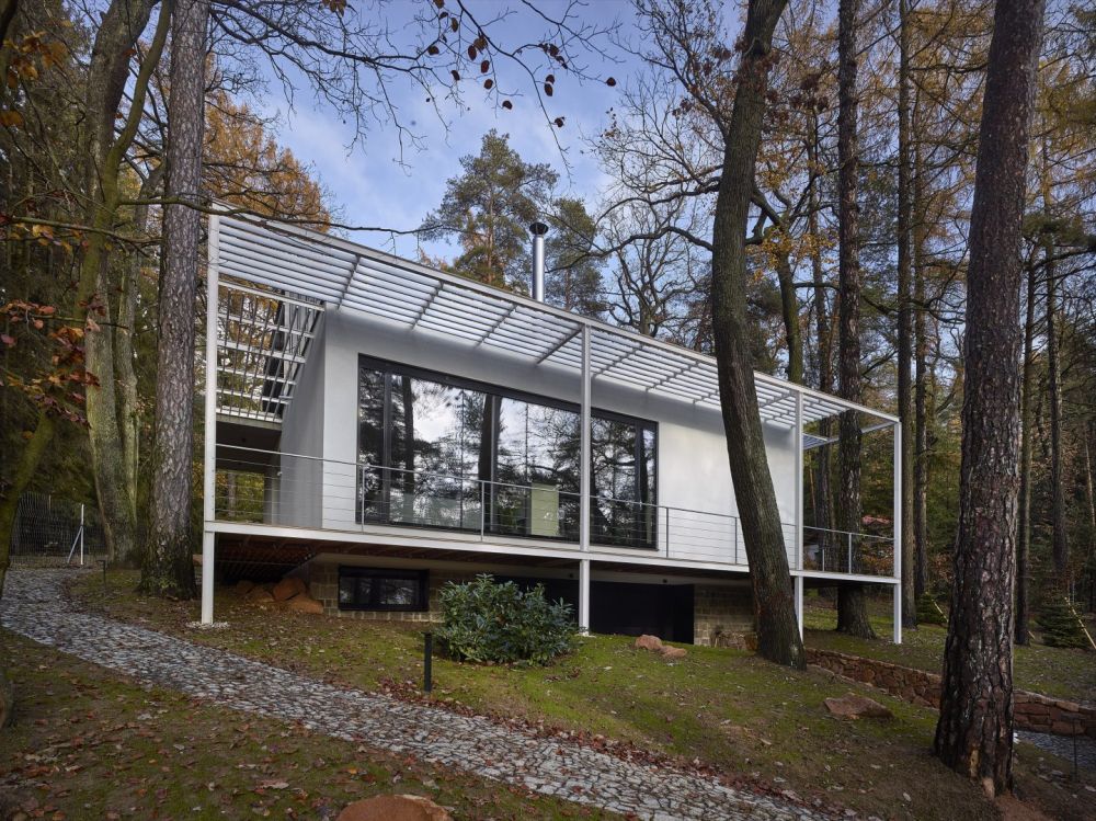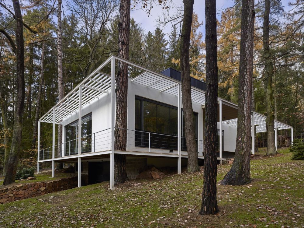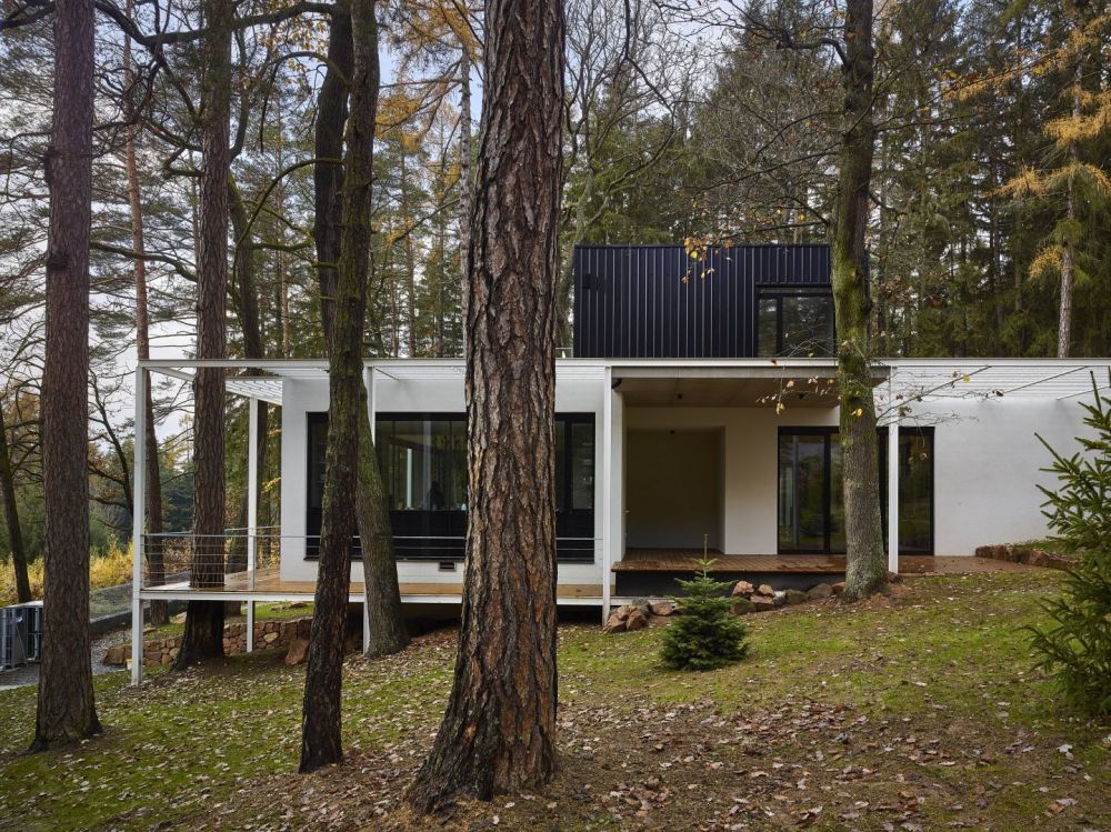Pozemek je svažitý a při ulici Lesní je dokonce výrazný terénní zlom. Morfologie terénu jsme využili tak, že je do terénního zlomu vestavěno podzemní podlaží. Nadzemní podlaží a jeho půdorys je ovlivněn pozicí vzrostlých stromů. Což byl i velký benefit parcely. Stavbu jsme chtěli vložit do „lesa“, pozice stromů částečně ovlivnily tvar stavby. Díky velkorysému prosklení je procházka domem i procházkou lesem. Dům je orientován s výhledem na jižní stranu a terasy se obracejí na východní stranu. Nadzemní podlaží je ustupující. Celá stavba je pojata v jednoduchém funkčním stylu. Materiálové a barevné řešení je jednoduché, kombinovali jsme světlé hladké omítky, kámen a trapézový plech fasády ustupujícího podlaží pro zdůraznění přízemního podlaží. Obecně jsme chtěli vytvořit kontrast mezi čistou přírodou neovlivněnou lidským zásahem a objektem, jež představuje civilizovanost v nejčistší formě. I proto jsme zvolili bílou barvu jako forma hi-tech technologie.