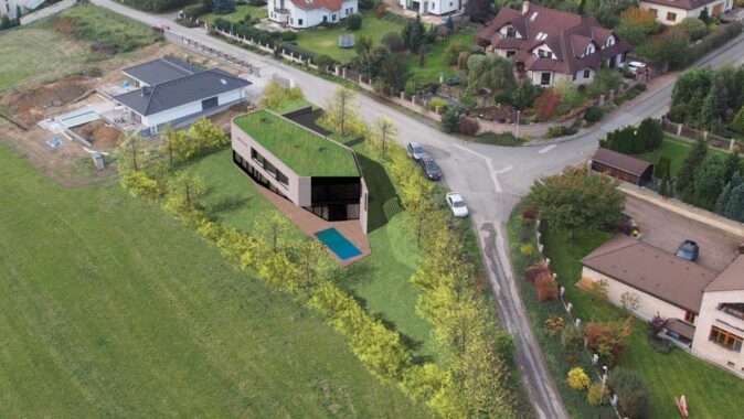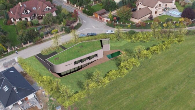 zapuštěné patro, 1. NP je polozapuštěné s otevřenou jižní částí, 2. NP je nadzemní.